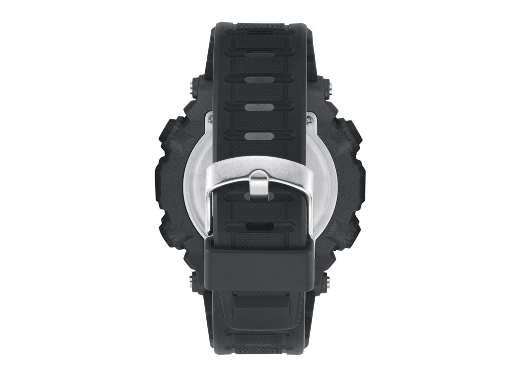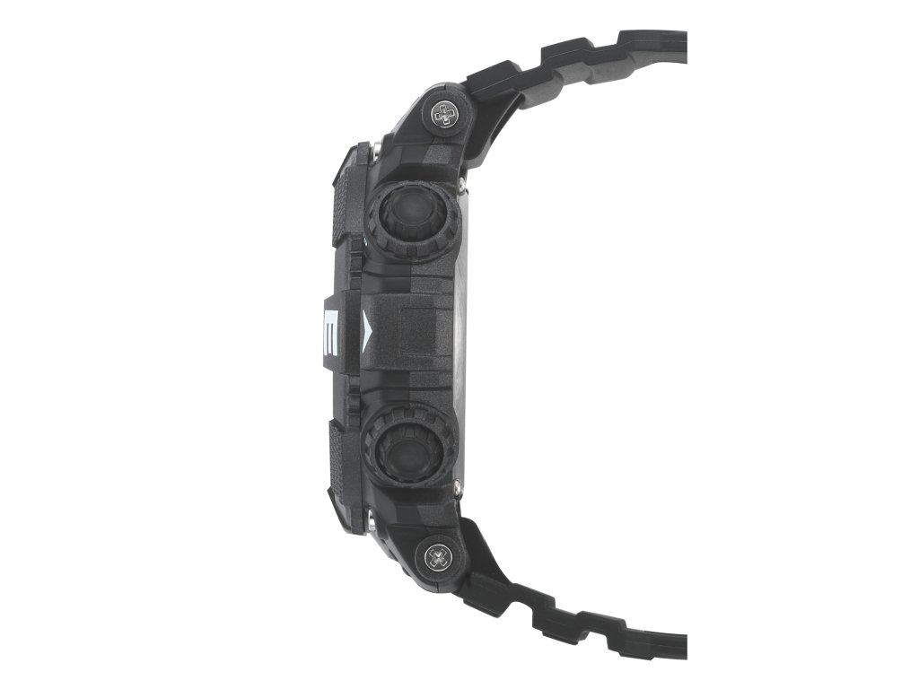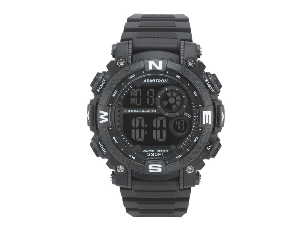 Športové digitálne hodinky s čiernou lunetou a bielymi značkami.