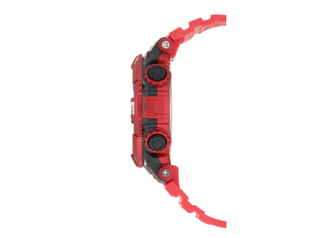Športové digitálne hodinky s čiernou a červenou lunetou a bielymi značkami.