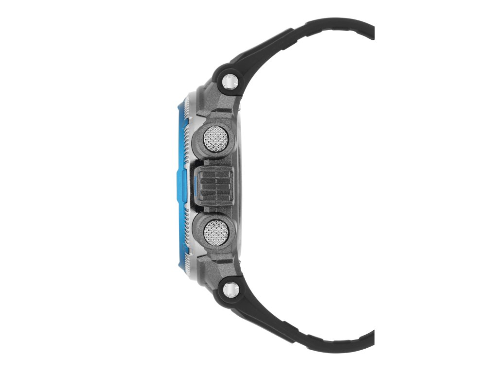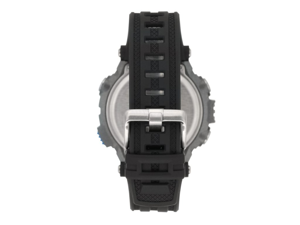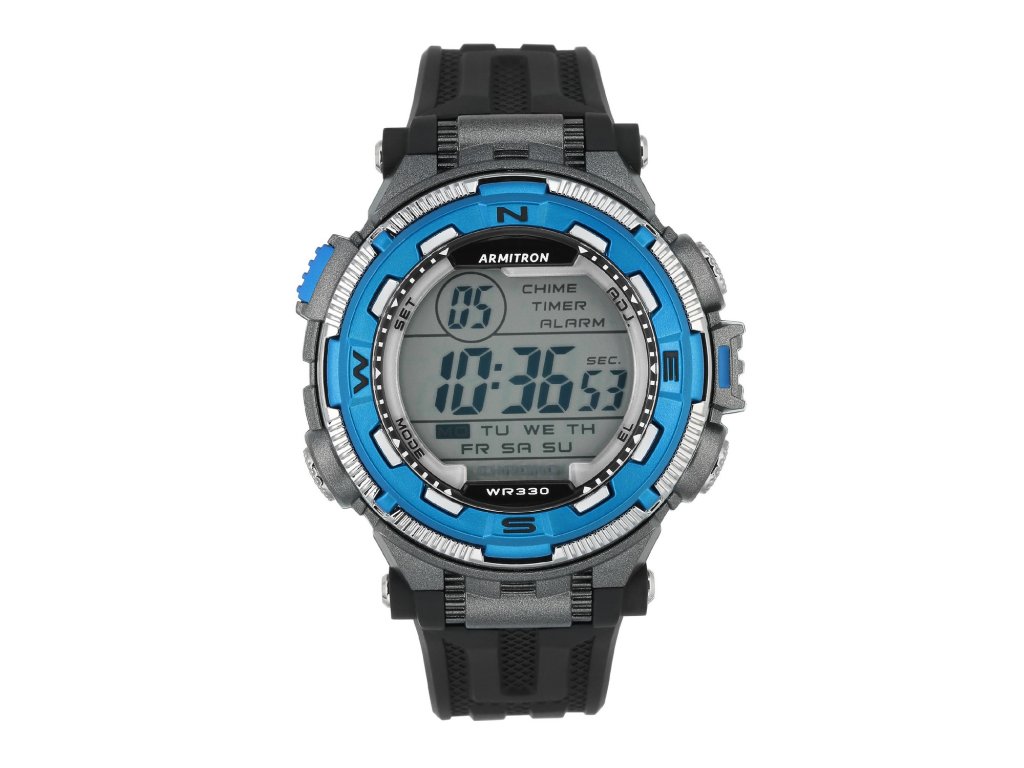 Športové digitálne hodinky s čierno-modro-striebornou lunetou a bielymi značkami.