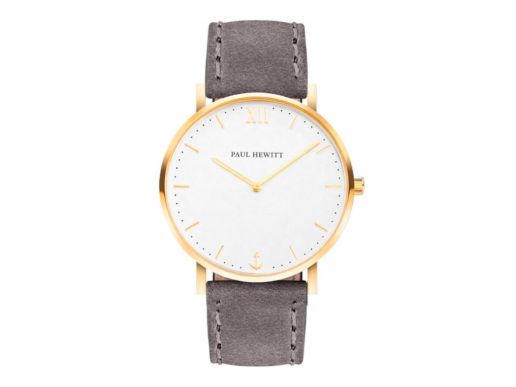 HODINKY PAUL HEWITT UNISEX SA-G-SM-W-13S (36MM). Typ mechanizmu: QUARTZ. Displej: HODINKY: ANALÓGOVÉ. Materiál puzdra: MATERIÁL: NEHRDZAVEJÚCA OCEĽ. Farba puzdra: FARBA: ZLATÁ. Materiál náramku: MATERIÁL NÁRAMKU: KOŽA. Farba náramku: FARBA NÁRAMKU: ŠEDÁ. Farba ciferníka: BIELA. Typ skla: SKLÍČKO: SAPPHIRE. Kľučka: BUCKLE. Priemer ciferníka: dĹŽKA CIFERNÍKA: 36 MM. Ponorný: 5ATM