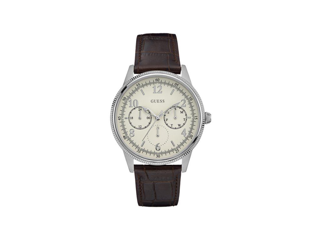HODINKY GUESS MAN W0863G1 (44MM). Typ mechanizmu: QUARTZ. Displej: TYP: ANALÓGOVÝ. Materiál puzdra: MATERIÁL: NEHRDZAVEJÚCA OCEĽ. Farba puzdra: Strieborná: farba puzdra: strieborná. Materiál náramku: Materiál náramku: Pu a kožený remienok. Farba náramku: Farba: hnedá. Farba ciferníka: biela. Typ skla: SKLÍČKO: MINERÁLNE. Kľučka: BUCKLE. Priemer ciferníka: dĹŽKA CIFERNÍKA: 44MM. Ponoriteľnosť: 5ATM