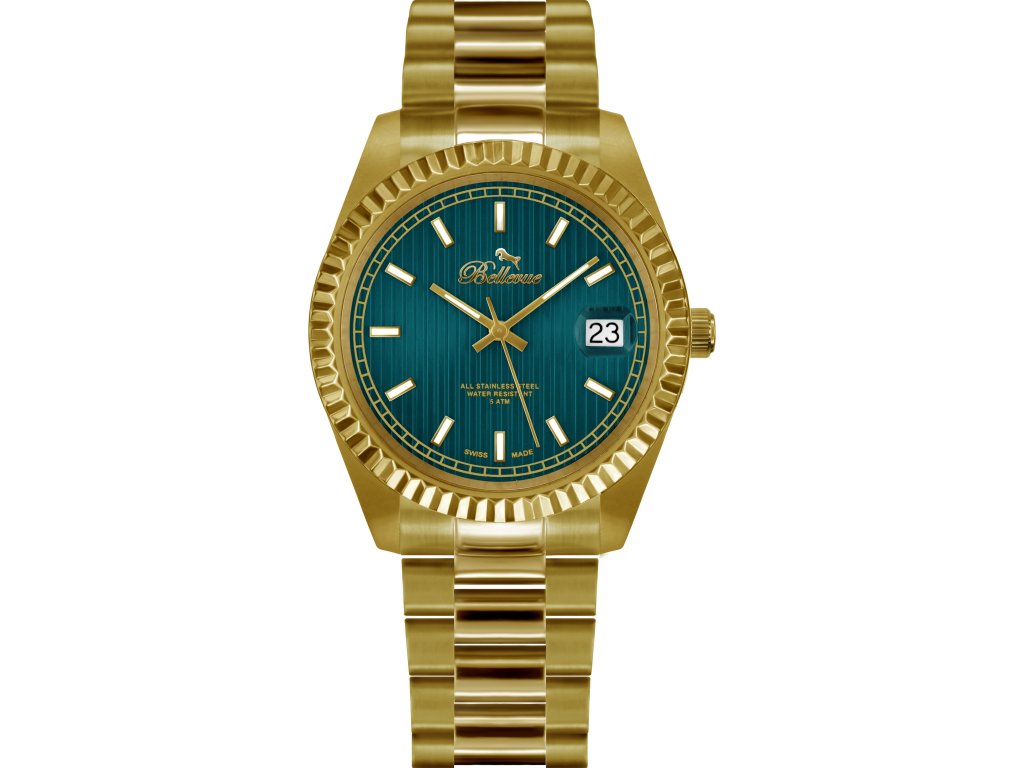 HODINKY BELLEVUE WOMAN H16 (30MM). Typ mechanizmu: QUARTZ. Displej: DISPLEJ: ANALÓGOVÝ. Materiál puzdra: MATERIÁL: NEHRDZAVEJÚCA OCEĽ. Farba puzdra: FARBA: ZLATÁ. Materiál náramku: MATERIÁL NÁRAMKU: NEHRDZAVEJÚCA OCEĽ. Farba náramku: ZLATÁ. Farba ciferníka: ZELENÁ. Typ skla: SKLÍČKO: MINERÁLNE. Sklo: BUTTERFLY. Priemer ciferníka: dĹŽKA CIFERNÍKA: 30MM. Ponoriteľnosť: 5ATM
