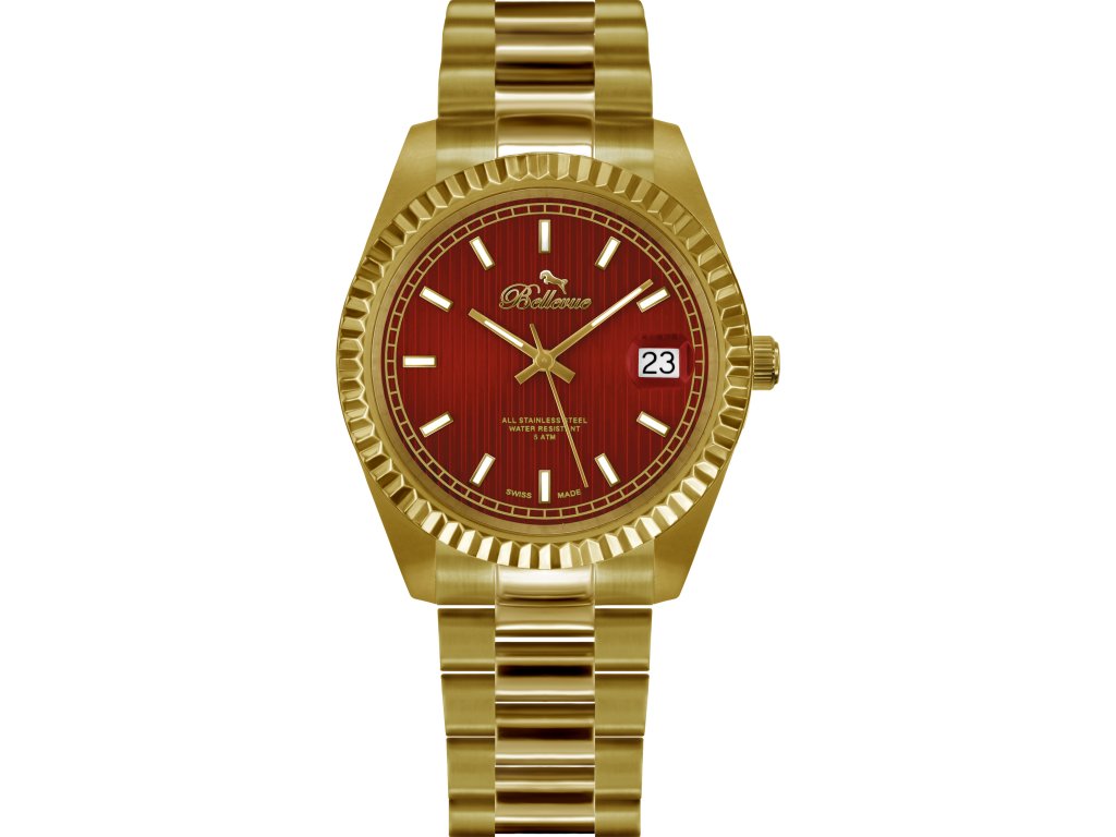 HODINKY BELLEVUE WOMAN H18 (30MM). Typ mechanizmu: QUARTZ. Displej: HODINKY: ANALÓGOVÉ. Materiál puzdra: MATERIÁL: NEHRDZAVEJÚCA OCEĽ. Farba puzdra: FARBA: ZLATÁ. Materiál náramku: MATERIÁL NÁRAMKU: NEHRDZAVEJÚCA OCEĽ. Farba náramku: ZLATÁ. Farba ciferníka: FARBA: ČERVENÁ. Typ skla: TYP SKLA: MINERÁLNE. Sklo: BUTTERFLY. Priemer ciferníka: dĹŽKA CIFERNÍKA: 30MM. Ponoriteľnosť: 5ATM