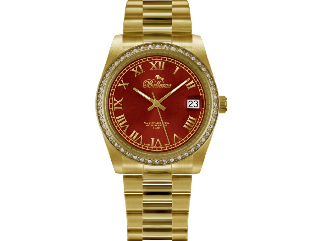 HODINKY BELLEVUE WOMAN I17 (35 MM). Typ mechanizmu: QUARTZ. Displej: HODINKY: ANALÓGOVÉ. Materiál puzdra: MATERIÁL: NEHRDZAVEJÚCA OCEĽ. Farba puzdra: FARBA: ŠEDÁ. Materiál náramku: MATERIÁL NÁRAMKU: NEHRDZAVEJÚCA OCEĽ. Farba náramku: FARBA NÁRAMKU: ZLATÁ. Farba ciferníka: FARBA: ČERVENÁ. Typ skla: TYP SKLA: MINERÁLNE. Sklo: BUTTERFLY. Priemer ciferníka: dĹŽKA CIFERNÍKA: 35 MM. Ponoriteľnosť: 5ATM