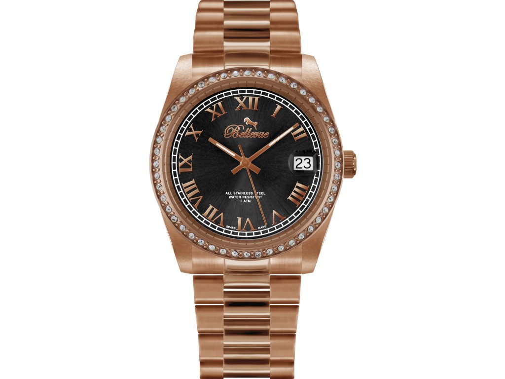 HODINKY BELLEVUE WOMAN I25 (35 MM). Typ mechanizmu: QUARTZ. Displej: HODINKY: ANALÓGOVÉ. Materiál puzdra: MATERIÁL: NEHRDZAVEJÚCA OCEĽ. Farba puzdra: FARBA: RUŽOVÁ. Materiál náramku: MATERIÁL NÁRAMKU: NEHRDZAVEJÚCA OCEĽ. Farba náramku: FARBA NÁRAMKU: ROSE. Farba ciferníka: ČIERNA. Typ skla: FARBA: MINERÁLNE. Clousure: BUTTERFLY. Priemer ciferníka: dĹŽKA CIFERNÍKA: 35 MM. Ponoriteľnosť: 5ATM