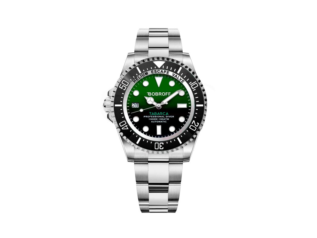 Hodinky BOBROFF MAN BF0002i (42 mm). Typ mechanizmu: TYP: AUTOMATICKÝ. Displej: DISPLEJ: ANALÓGOVÝ. Materiál puzdra: MATERIÁL: NEREZOVÁ OCEĽ. Farba puzdra: STRIEBORNÁ: FARBA PUZDRA: STRIEBORNÁ. Materiál náramku: MATERIÁL NÁRAMKU: NEHRDZAVEJÚCA OCEĽ. Farba náramku: FARBA NÁRAMKU: STRIEBORNÁ. Farba ciferníka: FARBA CIFERNÍKA: ZELENÁ. Typ skla: TYP SKLA: SAPPHIRE. Sklo: TLAK. Priemer ciferníka: dĺžka ciferníka: 42 mm. Ponorný: 100ATM