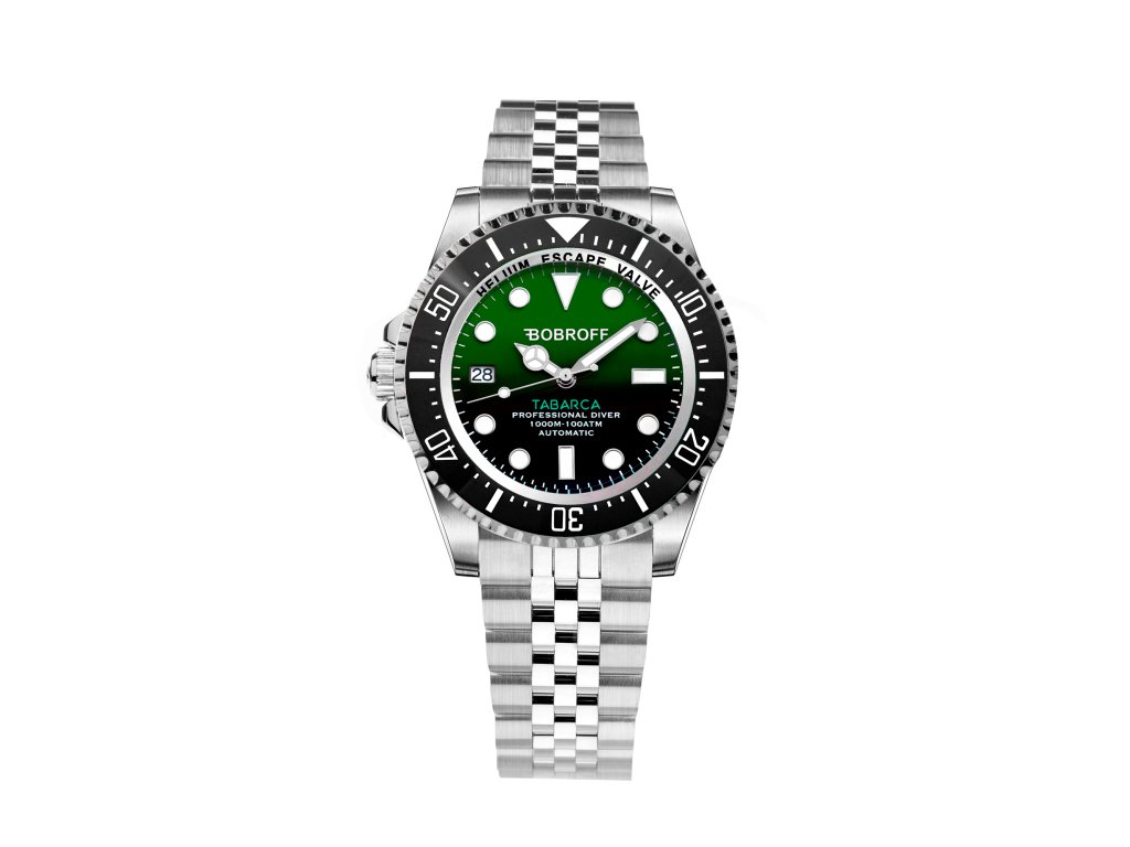 Hodinky BOBROFF MAN BF0002iJ (42 mm). Typ mechanizmu: TYP: AUTOMATICKÝ. Displej: DISPLEJ: ANALÓGOVÝ. Materiál puzdra: MATERIÁL: NEREZOVÁ OCEĽ. Farba puzdra: STRIEBORNÁ: FARBA PUZDRA: STRIEBORNÁ. Materiál náramku: MATERIÁL NÁRAMKU: NEHRDZAVEJÚCA OCEĽ. Farba náramku: FARBA NÁRAMKU: STRIEBORNÁ. Farba ciferníka: FARBA CIFERNÍKA: ZELENÁ. Typ skla: TYP SKLA: SAPPHIRE. Sklo: TLAK. Priemer ciferníka: dĺžka ciferníka: 42 mm. Ponorný: 100ATM