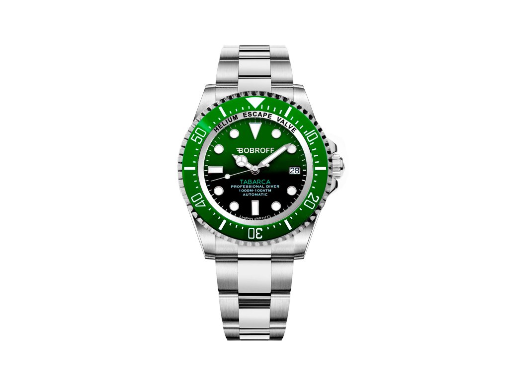 Hodinky BOBROFF MAN BF0002J1bv (44MM). Typ mechanizmu: TYP: AUTOMATICKÝ. Displej: DISPLEJ: ANALÓGOVÝ. Materiál puzdra: MATERIÁL: NEREZOVÁ OCEĽ. Farba puzdra: FARBA PUZDRA: ŠEDÁ. Materiál náramku: MATERIÁL NÁRAMKU: NEHRDZAVEJÚCA OCEĽ. Farba náramku: FARBA NÁRAMKU: ŠEDÁ. Farba ciferníka: FARBA CIFERNÍKA: ZELENÁ. Typ skla: TYP SKLA: SAPPHIRE. Sklo: TLAK. Priemer ciferníka: dĹŽKA CIFERNÍKA: 44MM. Ponorný: 100ATM