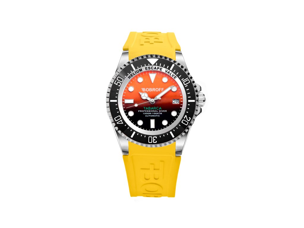 HODINKY BOBROFF MAN BF0004-BFSTA (44MM). Typ mechanizmu: TYP: AUTOMATICKÝ. Displej: TYP: ANALÓGOVÝ. Materiál puzdra: MATERIÁL: NEREZOVÁ OCEĽ. Farba puzdra: FARBA PUZDRA: ŠEDÁ. Materiál náramku: MATERIÁL NÁRAMKU: SILIKÓN. Farba náramku: FARBA NÁRAMKU: ŽLTÁ. Farba ciferníka: FARBA CIFERNÍKA: ORANŽOVÁ. Typ skla: TYP SKLA: SAPPHIRE. Kľučka: BUCKLE. Priemer ciferníka: dĹŽKA CIFERNÍKA: 44MM. Ponorný: 100ATM
