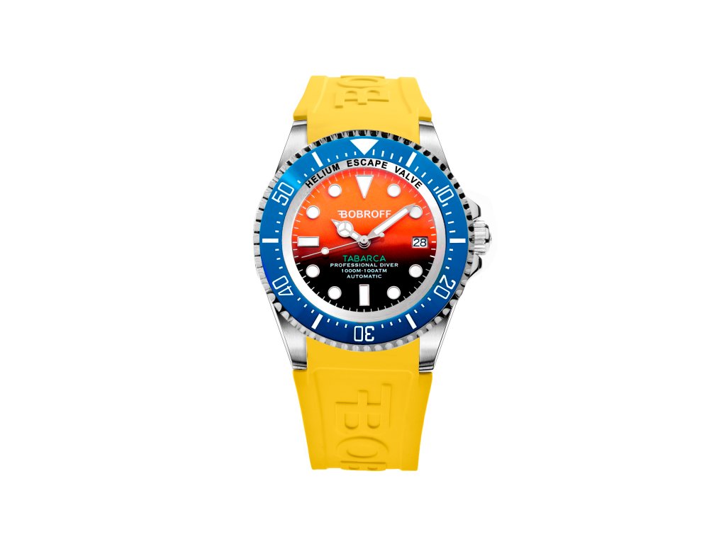 Hodinky BOBROFF MAN BF0004baBFSTA (44MM). Typ mechanizmu: TYP: AUTOMATICKÝ. Displej: TYP: ANALÓGOVÝ. Materiál puzdra: MATERIÁL: NEREZOVÁ OCEĽ. Farba puzdra: FARBA PUZDRA: ŠEDÁ. Materiál náramku: MATERIÁL NÁRAMKU: SILIKÓN. Farba náramku: FARBA NÁRAMKU: ŽLTÁ. Farba ciferníka: FARBA CIFERNÍKA: ORANŽOVÁ. Typ skla: TYP SKLA: SAPPHIRE. Kľučka: BUCKLE. Priemer ciferníka: dĹŽKA CIFERNÍKA: 44MM. Ponorný: 100ATM