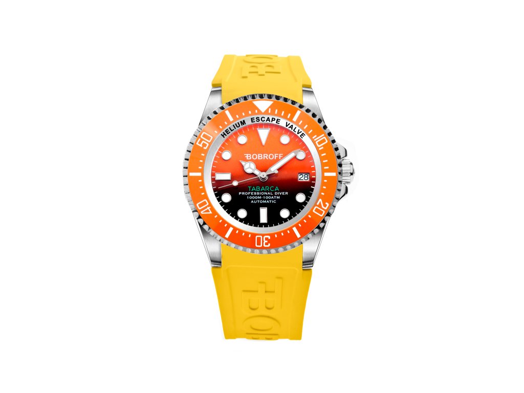 Hodinky BOBROFF MAN BF0004bnBFSTA (44MM). Typ mechanizmu: TYP: AUTOMATICKÝ. Displej: DISPLEJ: ANALÓGOVÝ. Materiál puzdra: MATERIÁL: NEREZOVÁ OCEĽ. Farba puzdra: FARBA PUZDRA: ŠEDÁ. Materiál náramku: MATERIÁL NÁRAMKU: SILIKÓN. Farba náramku: FARBA NÁRAMKU: ŽLTÁ. Farba ciferníka: FARBA CIFERNÍKA: ORANŽOVÁ. Typ skla: TYP SKLA: SAPPHIRE. Kľučka: BUCKLE. Priemer ciferníka: dĹŽKA CIFERNÍKA: 44MM. Ponorný: 100ATM