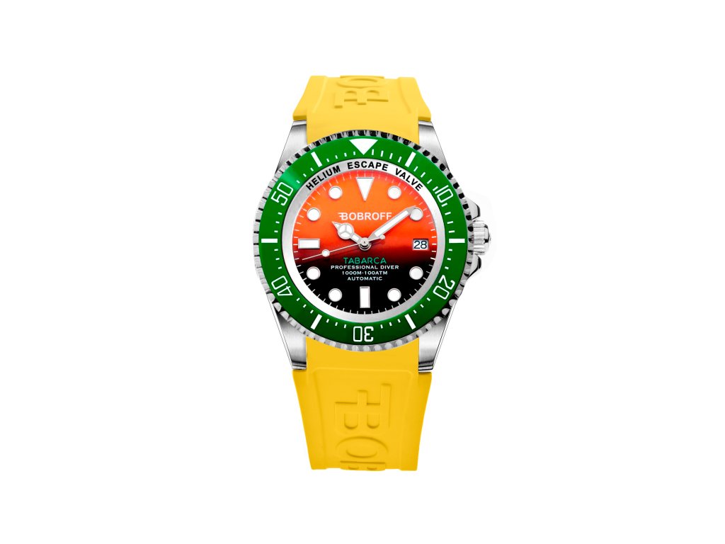 Hodinky BOBROFF MAN BF0004bvBFSTA (44MM). Typ mechanizmu: TYP: AUTOMATICKÝ. Displej: DIZAJN: ANALÓGOVÝ. Materiál puzdra: MATERIÁL: NEREZOVÁ OCEĽ. Farba puzdra: FARBA PUZDRA: ŠEDÁ. Materiál náramku: MATERIÁL NÁRAMKU: SILIKÓN. Farba náramku: FARBA NÁRAMKU: ŽLTÁ. Farba ciferníka: FARBA CIFERNÍKA: ORANŽOVÁ. Typ skla: TYP SKLA: SAPPHIRE. Kľučka: BUCKLE. Priemer ciferníka: dĹŽKA CIFERNÍKA: 44MM. Ponorný: 100ATM