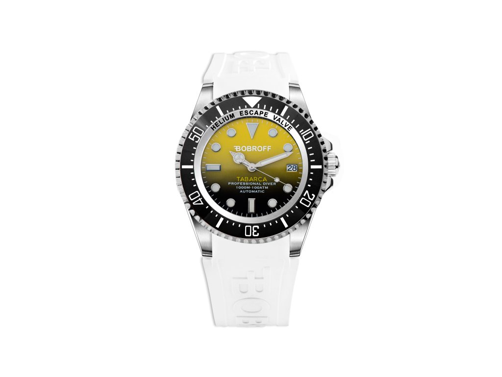 HODINKY BOBROFF MAN BF0008-BFSTB (44MM). Typ mechanizmu: TYP: AUTOMATICKÝ. Displej: TYP: ANALÓGOVÝ. Materiál puzdra: MATERIÁL: NEREZOVÁ OCEĽ. Farba puzdra: FARBA PUZDRA: ŠEDÁ. Materiál náramku: MATERIÁL NÁRAMKU: SILIKÓN. Farba náramku: FARBA NÁRAMKU: BIELA. Farba ciferníka: ŽLTÁ. Typ skla: TYP SKLA: SAPPHIRE. Kľučka: BUCKLE. Priemer ciferníka: dĹŽKA CIFERNÍKA: 44MM. Ponorný: 100ATM