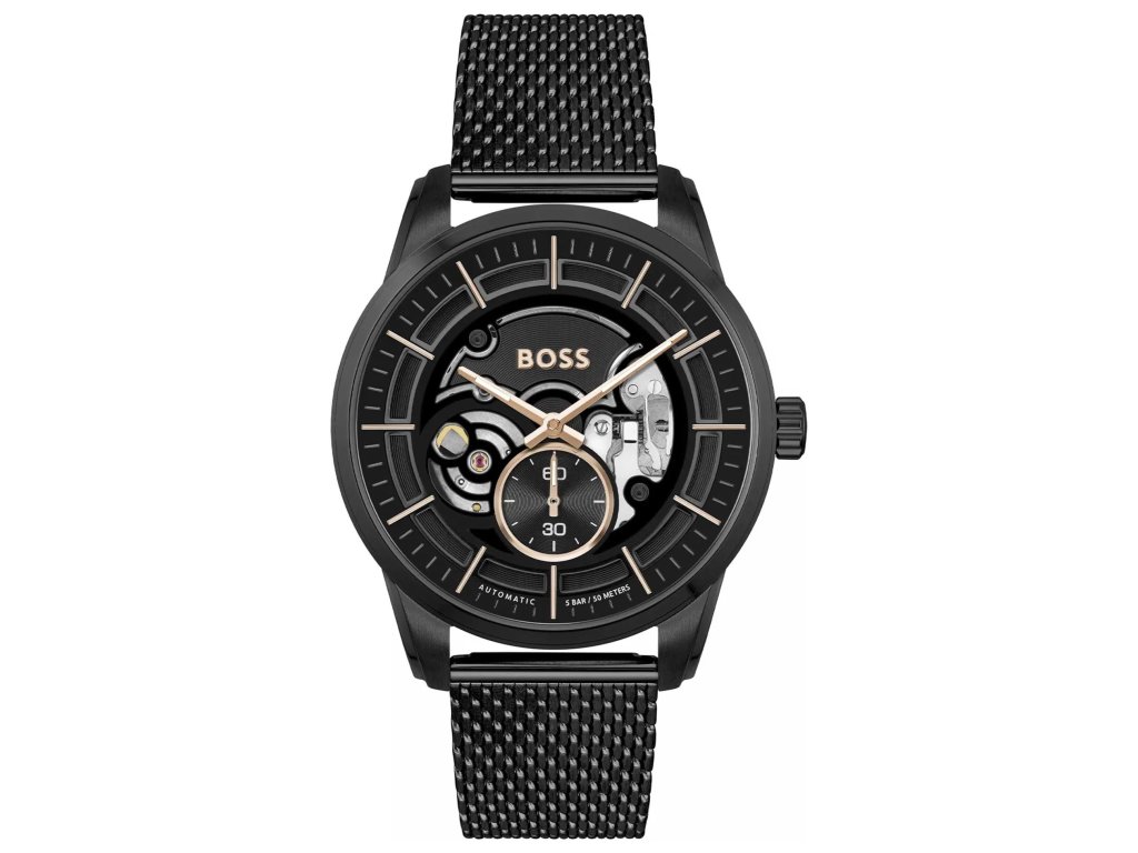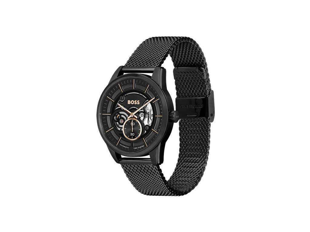 HODINKY BOSS MAN 1514035 (42MM). Typ mechanizmu: TYP: AUTOMATICKÝ. Displej: DISPLEJ: ANALÓGOVÝ. Materiál puzdra: MATERIÁL: NEREZOVÁ OCEĽ. Farba puzdra: FARBA PUZDRA: ČIERNA. Materiál náramku: MATERIÁL NÁRAMKU: NEHRDZAVEJÚCA OCEĽ. Farba náramku: FARBA NÁRAMKU: ČIERNA. Farba ciferníka: ČIERNA. Typ skla: MINERÁLNE. Clousure: HITCH. Priemer ciferníka: dĹŽKA CIFERNÍKA: 42MM. Ponoriteľnosť: 5ATM