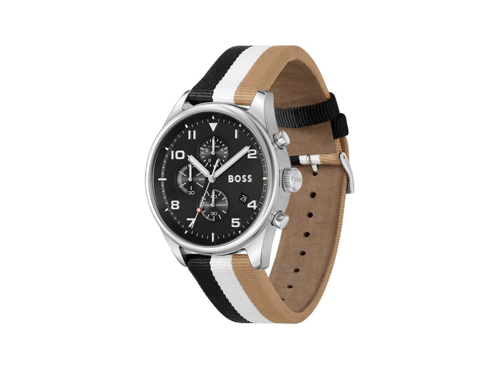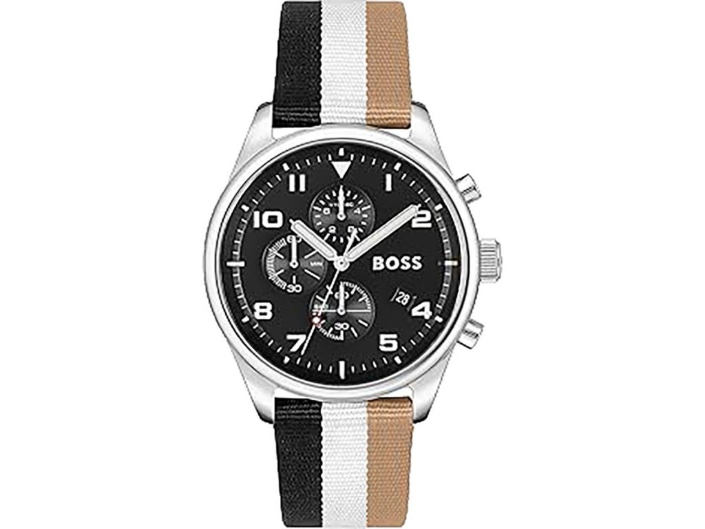 HODINKY BOSS MAN 1514062 (44MM). Typ mechanizmu: QUARTZ. Displej: HODINKY: ANALOGICKÉ. Materiál puzdra: MATERIÁL: NEHRDZAVEJÚCA OCEĽ. Farba puzdra: STRIEBORNÁ: FARBA PUZDRA: STRIEBORNÁ. Materiál náramku: MATERIÁL NÁRAMKU: KOŽA. Farba náramku: FARBA: ČIERNA, BIELA, HNEDÁ. Farba ciferníka: ČIERNA. Typ skla: SKLÍČKO: MINERÁLNE. Kľučka: BUCKLE. Priemer ciferníka: dĹŽKA CIFERNÍKA: 44MM. Ponoriteľnosť: 5ATM