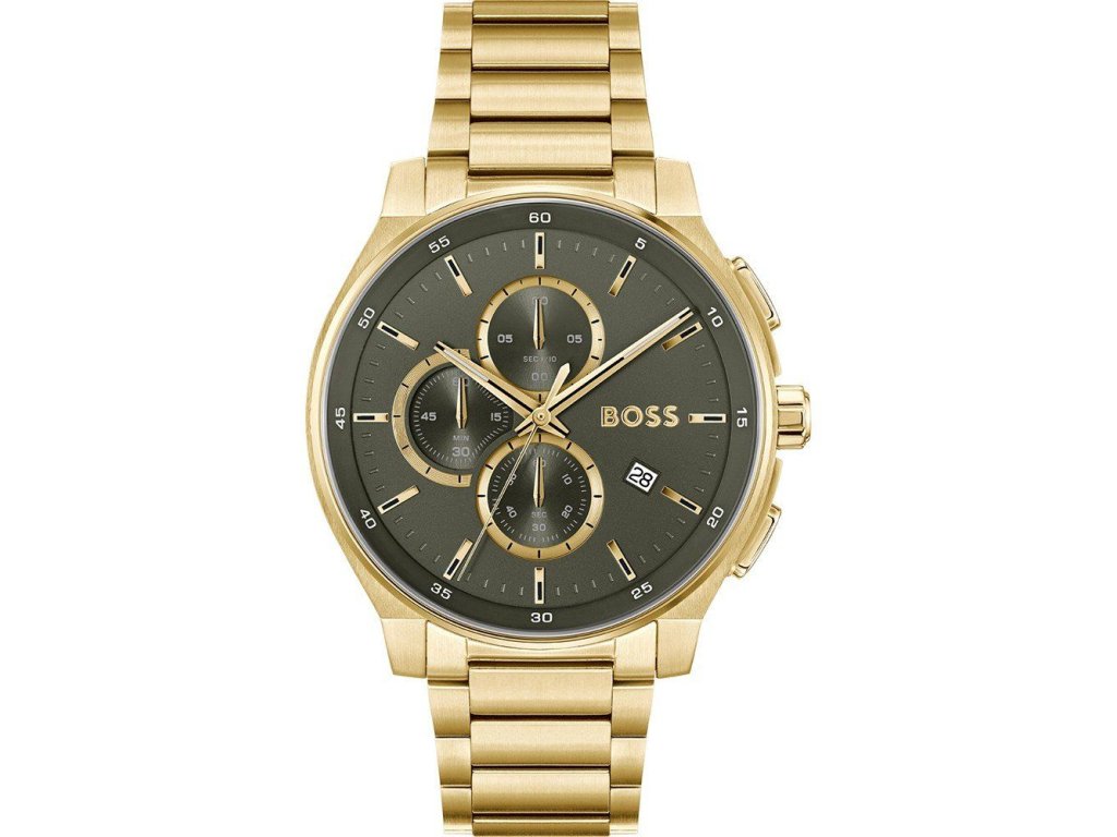 HODINKY BOSS MAN 1514190 (44MM). Typ mechanizmu: QUARTZ. Displej: HODINKY: ANALOGICKÉ. Materiál puzdra: MATERIÁL: NEHRDZAVEJÚCA OCEĽ. Farba puzdra: FARBA: ZLATÁ. Materiál náramku: MATERIÁL NÁRAMKU: NEHRDZAVEJÚCA OCEĽ. Farba náramku: ZLATÁ. Farba ciferníka: HNEDÁ. Typ skla: SKLÍČKO: MINERÁLNE. Clousure: BUTTERFLY. Priemer ciferníka: dĹŽKA CIFERNÍKA: 44MM. Ponoriteľnosť: 5ATM