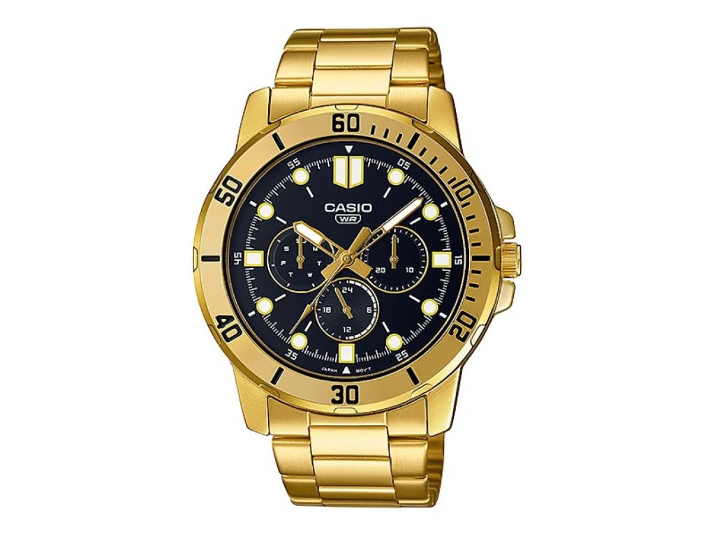 HODINKY CASIO MAN MTPVD300G1EUD (45MM). Typ mechanizmu: QUARTZ. Displej: TYP: ANALÓGOVÝ. Materiál puzdra: MATERIÁL: NEHRDZAVEJÚCA OCEĽ. Farba puzdra: FARBA: ZLATÁ. Materiál náramku: MATERIÁL NÁRAMKU: NEHRDZAVEJÚCA OCEĽ. Farba náramku: ZLATÁ. Farba ciferníka: ČIERNA. Typ skla: MINERÁLNE. Clousure: SKLENENÉ SKLO: FOLD-OUT. Priemer ciferníka: dĹŽKA CIFERNÍKA: 45 MM. Ponorný: hĹBKA: 3ATM