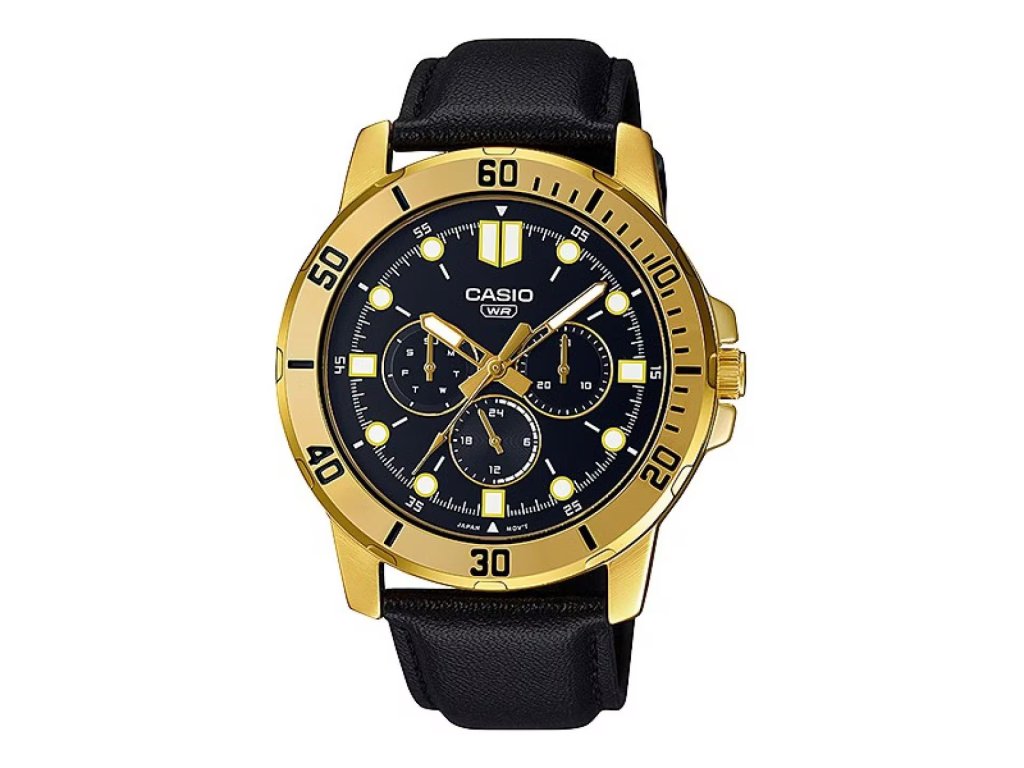 HODINKY CASIO MAN MTPVD300GL1EU (45MM). Typ mechanizmu: QUARTZ. Displej: TYP: ANALÓGOVÝ. Materiál puzdra: MATERIÁL: NEHRDZAVEJÚCA OCEĽ. Farba puzdra: FARBA: ZLATÁ. Materiál náramku: MATERIÁL NÁRAMKU: KOŽA. Farba náramku: FARBA NÁRAMKU: ČIERNA. Farba ciferníka: ČIERNA. Typ skla: SKLÍČKO: MINERÁLNE. Kľučka: BUCKLE. Priemer ciferníka: dĹŽKA CIFERNÍKA: 45MM. Ponorný: hĹBKA: 3ATM