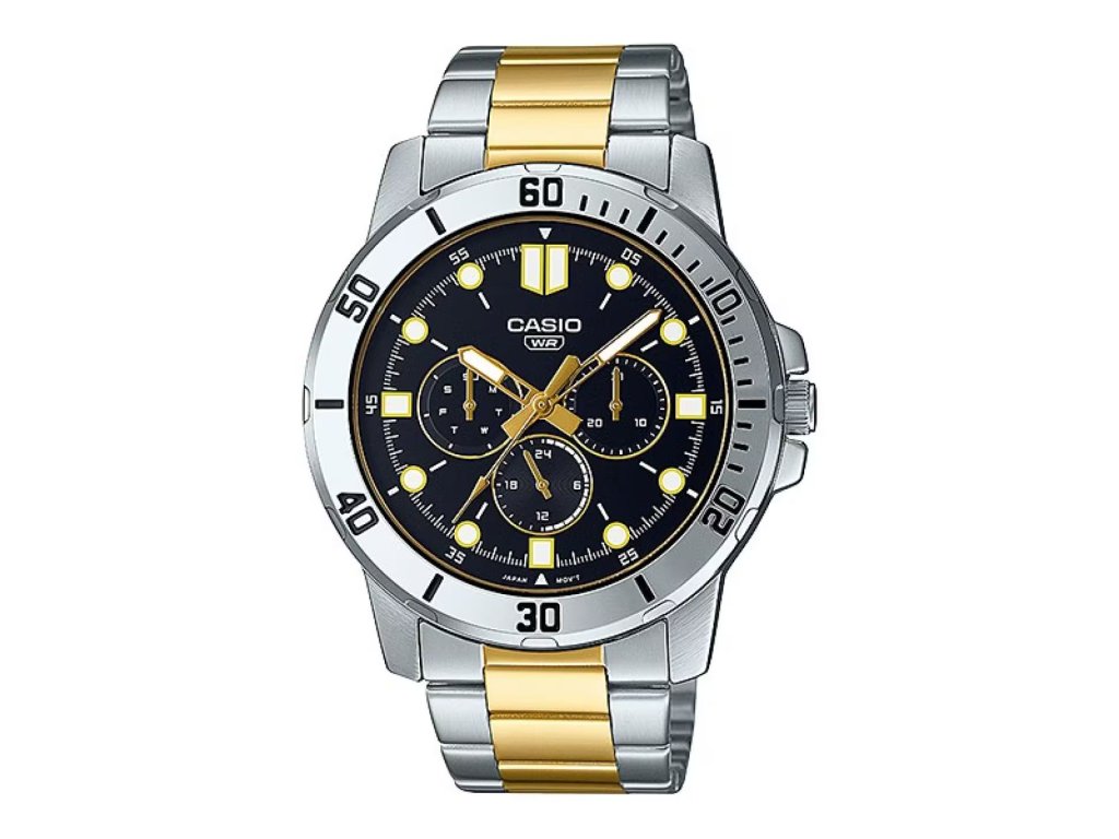 HODINKY CASIO MAN MTPVD300SG1EU (45MM). Typ mechanizmu: QUARTZ. Displej: HODINKY: ANALOGICKÉ. Materiál puzdra: MATERIÁL: NEHRDZAVEJÚCA OCEĽ. Farba puzdra: FARBA PUZDRA: ŠEDÁ. Materiál náramku: MATERIÁL NÁRAMKU: NEHRDZAVEJÚCA OCEĽ. Farba náramku: FARBA: ZLATÁ. Farba ciferníka: ČIERNA. Typ skla: MINERÁLNE. Clousure: SKLENENÉ SKLO: FOLD-OUT. Priemer ciferníka: dĹŽKA CIFERNÍKA: 45 MM. Ponorný: hĹBKA: 3ATM