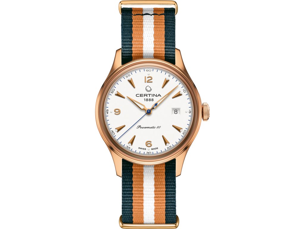 HODINKY CERTINA MAN C038407380370 (41MM). Typ mechanizmu: TYP HODINIEK: AUTOMATICKÉ. Displej: DISPLEJ: ANALOGICKÝ. Materiál puzdra: MATERIÁL: NEREZOVÁ OCEĽ. Farba puzdra: FARBA: ZLATÁ. Materiál náramku: MATERIÁL NÁRAMKU: TKANINA. Farba náramku: FARBA NÁRAMKU: MODRÁ. Farba ciferníka: BIELA. Typ skla: TYP SKLA: SAPPHIRE. Kľučka: BUCKLE. Priemer ciferníka: pRIEMER CIFERNÍKA: 41MM. Ponoriteľnosť: 10 ATM