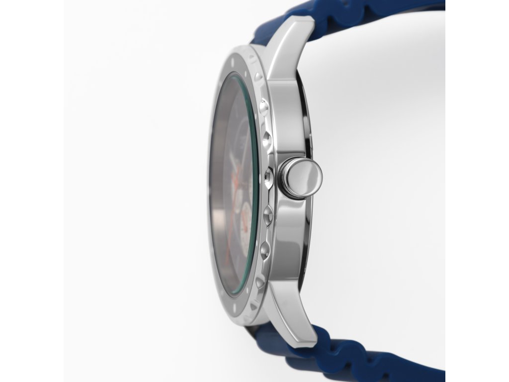 Menší, kráľovsky modrý ciferník s priemerom 45 mm veľmi pekne ladí s okrúhlym puzdrom z nehrdzavejúcej ocele rovnakej farby, na ktorom je umiestnený praktický tachymeter. Ciferníku dominuje chronograf, ukazovateľ dátumu,štýlové ručičky a indexy. Modrý gumový remienok tohto doplnku potom zaručuje pohodlie pri každodennom nosení.