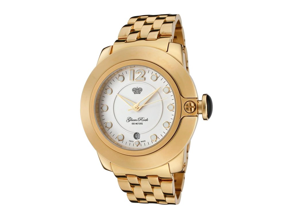 HODINKY GLAM ROCK WOMAN GR32055 (44MM). Typ mechanizmu: ŠVAJČIARSKY OKRÚHLY QUARTZ. Displej: HODINKY: ANALÓGOVÉ. Materiál puzdra: MATERIÁL PUZDRA: OCEĽ. Farba puzdra: FARBA PUZDRA: ZLATÁ. Materiál náramku: MATERIÁL NÁRAMKU: OCEĽ. Farba náramku: FARBA NÁRAMKU: ZLATÁ. Farba ciferníka: BIELA. Typ skla: SKLÍČKO: SAFFIR. Clousure: TLAK: 1,5 MM. Priemer ciferníka: dĹŽKA CIFERNÍKA: 44MM. Ponorný: 10ATM