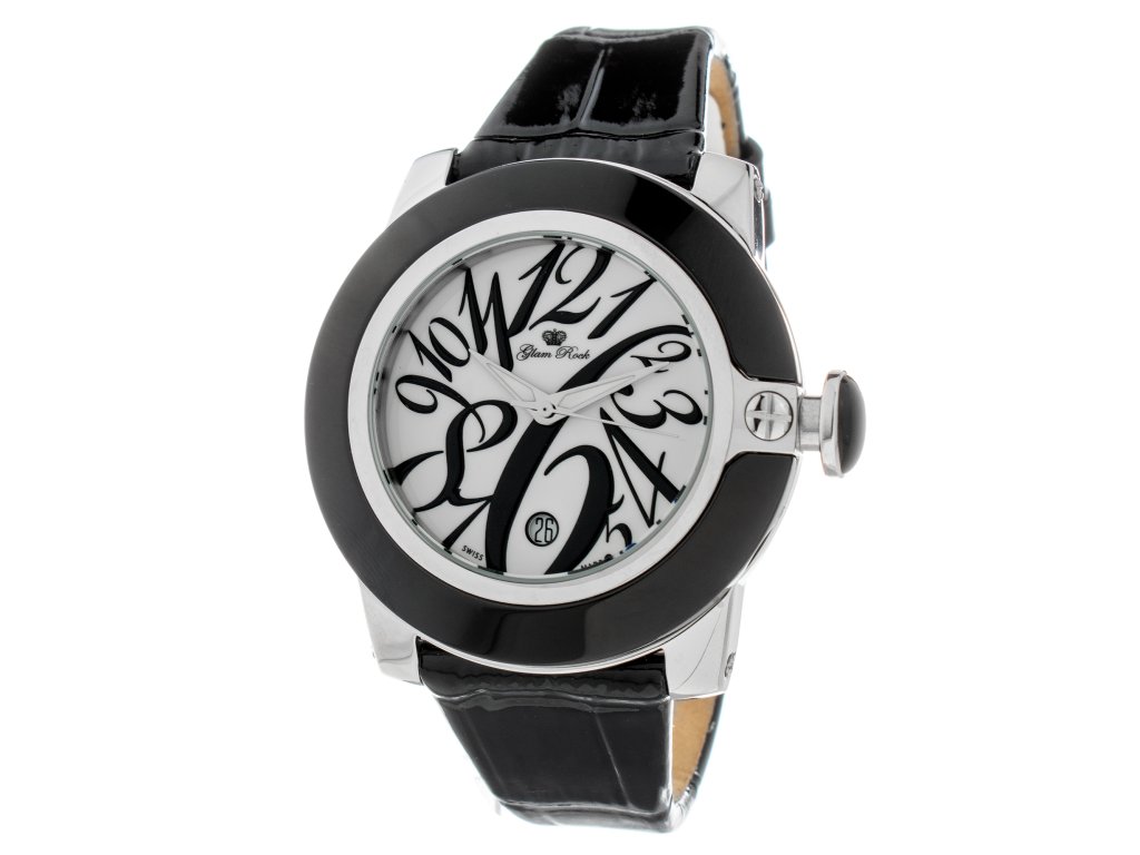 HODINKY GLAM ROCK WOMAN GR32083 (44MM). Typ mechanizmu: ŠVAJČIARSKY OKRÚHLY QUARTZ. Displej: HODINKY: ANALÓGOVÉ. Materiál puzdra: MATERIÁL PUZDRA: OCEĽ. Farba puzdra: STRIEBORNÁ: FARBA PUZDRA: STRIEBORNÁ. Materiál náramku: MATERIÁL NÁRAMKU: KOŽA. Farba náramku: FARBA NÁRAMKU: ČIERNA. Farba ciferníka: BIELA. Typ skla: SKLÍČKO: SAFFIR. Kľučka: BUCKLE. Priemer ciferníka: dĹŽKA CIFERNÍKA: 44MM. Ponorný: 10ATM