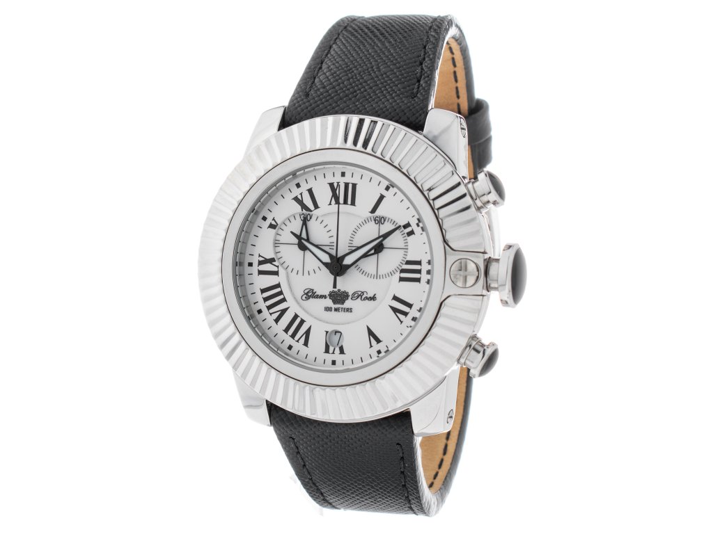 HODINKY GLAM ROCK WOMAN GR32107 (44MM). Typ mechanizmu: QUARTZOVÉ HODINKY ŠVAJČIARSKEJ VÝROBY. Displej: HODINKY: ANALÓGOVÉ. Materiál puzdra: MATERIÁL PUZDRA: OCEĽ. Farba puzdra: STRIEBORNÁ: FARBA PUZDRA: STRIEBORNÁ. Materiál náramku: MATERIÁL NÁRAMKU: KOŽA. Farba náramku: FARBA NÁRAMKU: ČIERNA. Farba ciferníka: BIELA. Typ skla: SKLÍČKO: SAPPHIRE. Kľučka: BUCKLE. Priemer ciferníka: dĹŽKA CIFERNÍKA: 44MM. Ponorný: 10ATM