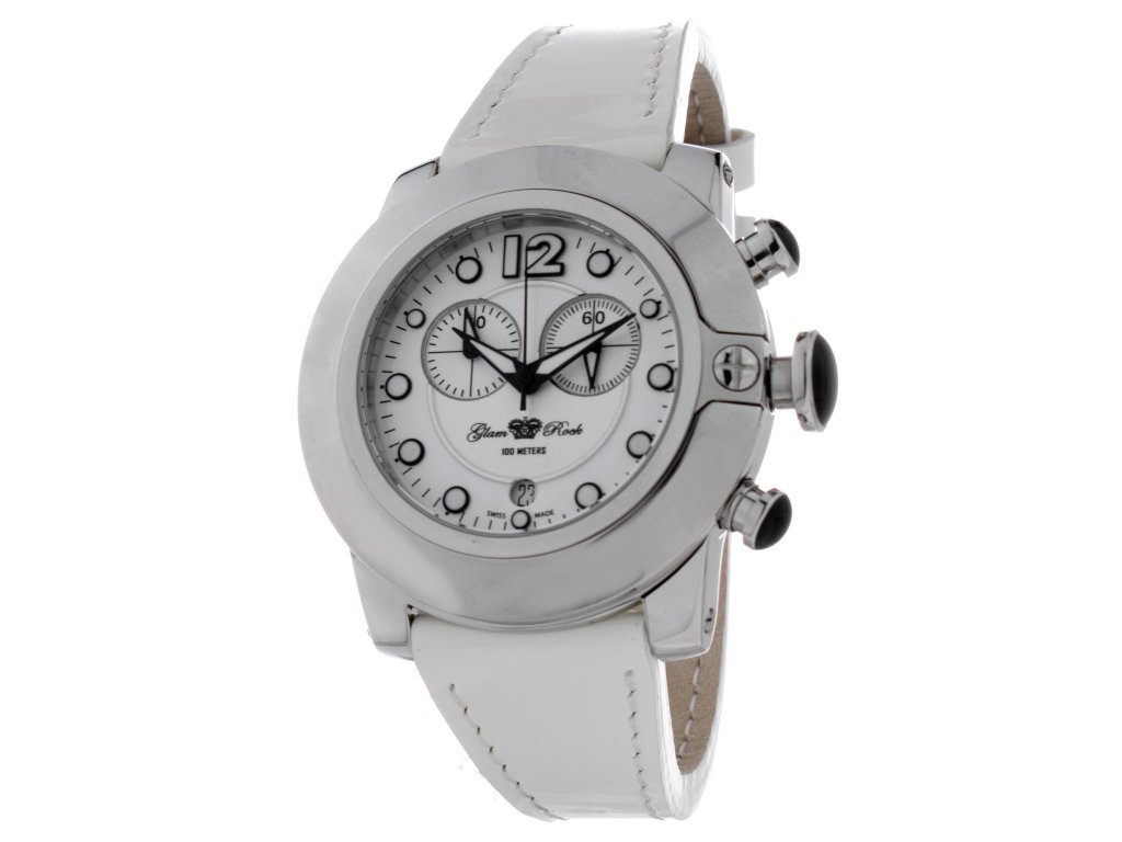 HODINKY GLAM ROCK WOMAN GR32153 (44MM). Typ mechanizmu: ŠVAJČIARSKY OKRÚHLY QUARTZ. Displej: HODINKY: ANALÓGOVÉ. Materiál puzdra: MATERIÁL PUZDRA: OCEĽ. Farba puzdra: STRIEBORNÁ: FARBA PUZDRA: STRIEBORNÁ. Materiál náramku: MATERIÁL NÁRAMKU: KOŽA. Farba náramku: FARBA NÁRAMKU: BIELA. Farba ciferníka: BIELA. Typ skla: SKLÍČKO: SAFFIR. Kľučka: BUCKLE. Priemer ciferníka: dĹŽKA CIFERNÍKA: 44MM. Ponorný: 10ATM