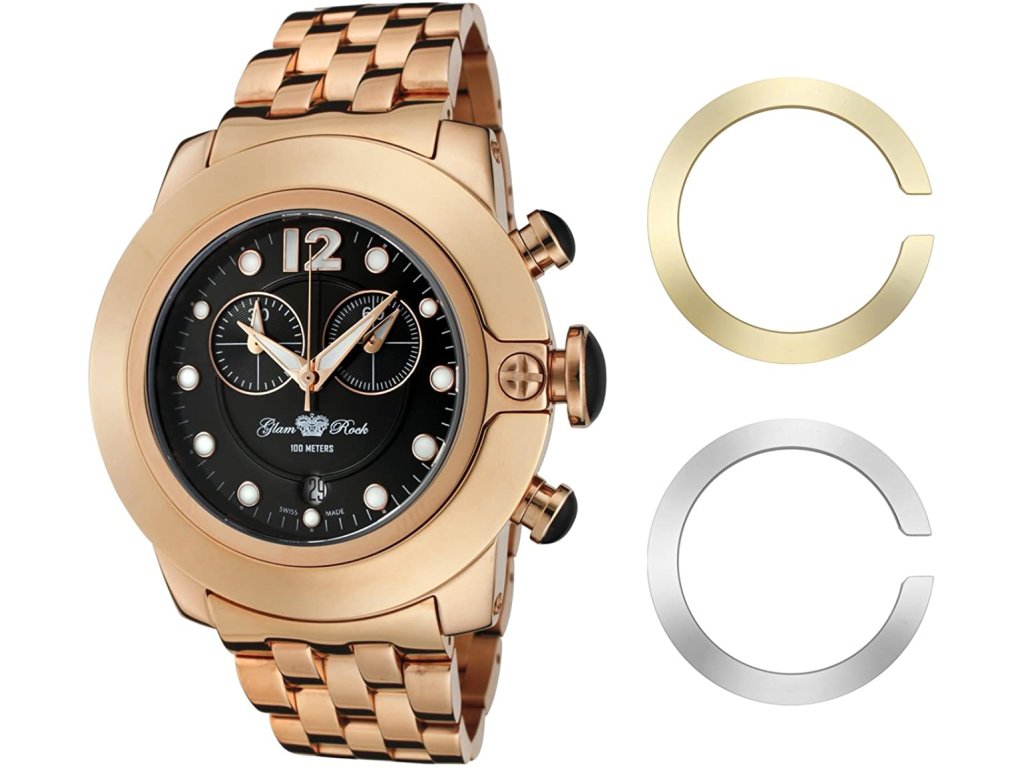 HODINKY GLAM ROCK WOMAN GR32156 (44MM). Typ mechanizmu: ŠVAJČIARSKY OKRÚHLY QUARTZ. Displej: HODINKY: ANALÓGOVÉ. Materiál puzdra: MATERIÁL PUZDRA: OCEĽ. Farba puzdra: FARBA PUZDRA: ZLATÁ. Materiál náramku: MATERIÁL NÁRAMKU: OCEĽ. Farba náramku: FARBA NÁRAMKU: RUŽOVÉ ZLATO. Farba ciferníka: ČIERNA. Typ skla: SKLÍČKO: SAFFIR. Clousure: TLAK: 1,5 MM. Priemer ciferníka: dĹŽKA CIFERNÍKA: 44MM. Ponorný: 10ATM