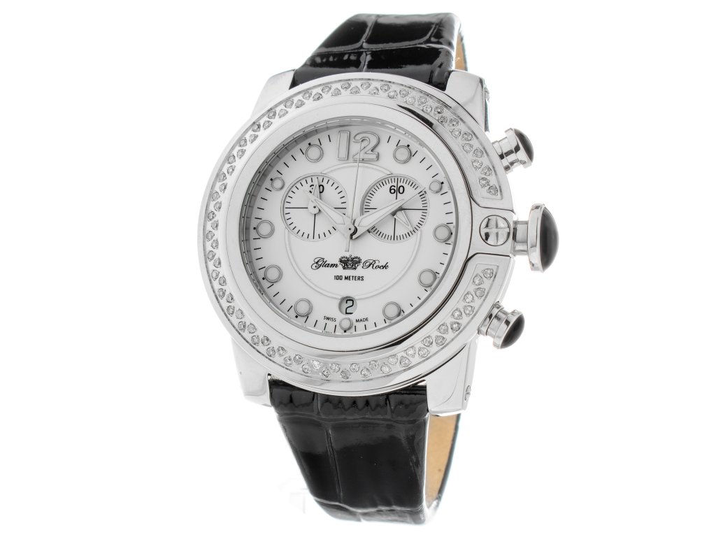 HODINKY GLAM ROCK WOMAN GR32174D (46MM). Typ mechanizmu: ŠVAJČIARSKY OKRÚHLY QUARTZ. Displej: HODINKY: ANALÓGOVÉ. Materiál puzdra: MATERIÁL PUZDRA: OCEĽ. Farba puzdra: STRIEBORNÁ: FARBA PUZDRA: STRIEBORNÁ. Materiál náramku: MATERIÁL NÁRAMKU: KOŽA. Farba náramku: FARBA NÁRAMKU: ČIERNA. Farba ciferníka: BIELA. Typ skla: SKLÍČKO: SAFFIR. Kľučka: BUCKLE. Priemer ciferníka: dĹŽKA CIFERNÍKA: 46MM. Ponorný: 10ATM