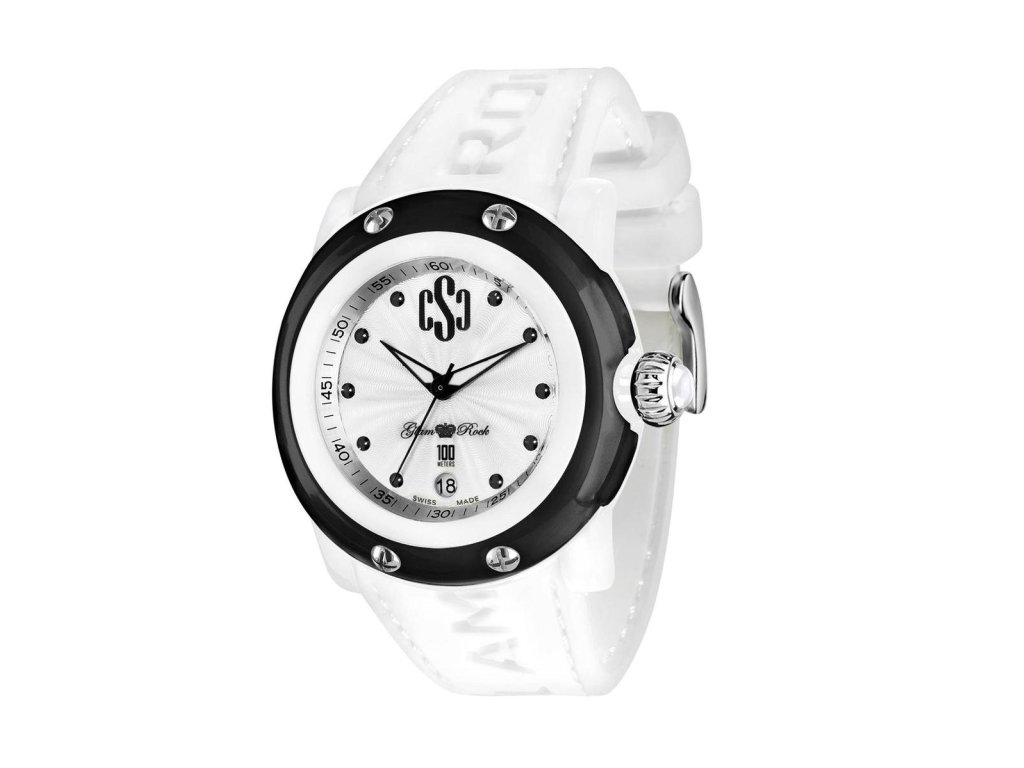 HODINKY GLAM ROCK WOMAN GR62009 (46MM). Typ mechanizmu: ŠVAJČIARSKY OKRÚHLY QUARTZ. Displej: HODINKY: ANALÓGOVÉ. Materiál puzdra: MATERIÁL PUZDRA: POLYKLARBONÁT. Farba puzdra: FARBA PUZDRA: BIELA. Materiál náramku: MATERIÁL: SILIKÓN. Farba náramku: FARBA NÁRAMKU: BIELA. Farba ciferníka: BIELA. Typ skla: SKLÍČKO: SAFFIR. Kľučka: BUCKLE. Priemer ciferníka: dĹŽKA CIFERNÍKA: 46MM. Ponorný: 10ATM