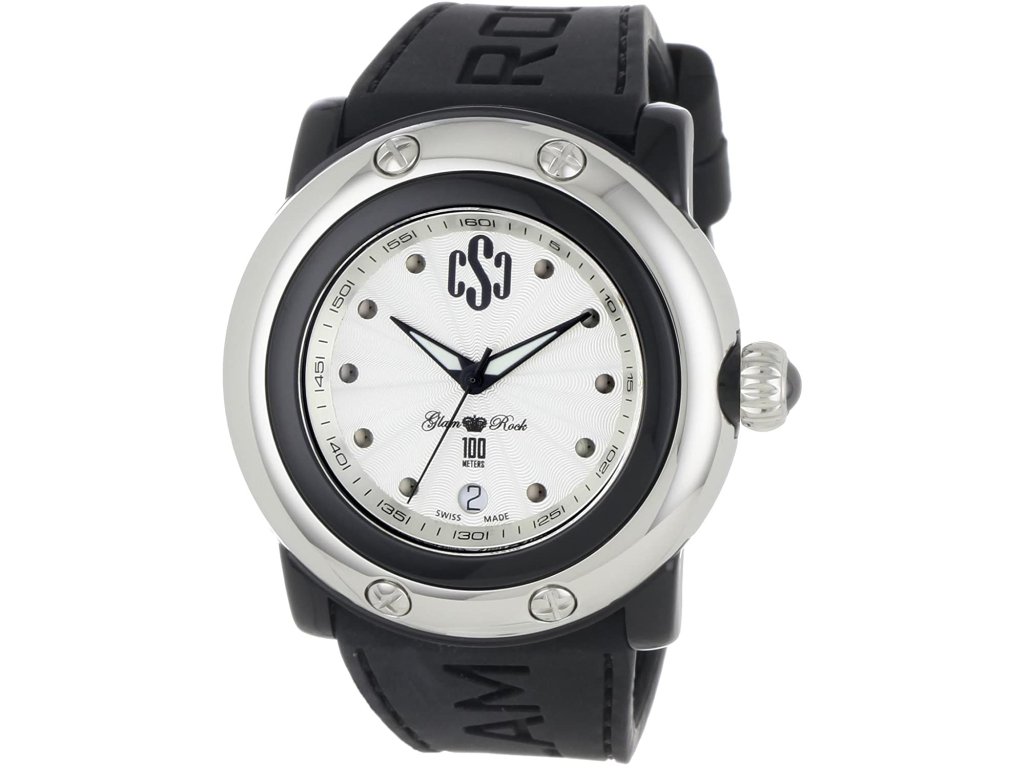 HODINKY GLAM ROCK WOMAN GR62020 (46MM). Typ mechanizmu: ŠVAJČIARSKY OKRÚHLY QUARTZ. Displej: HODINKY: ANALÓGOVÉ. Materiál puzdra: MATERIÁL PUZDRA: POLYKLARBONÁT. Farba puzdra: FARBA PUZDRA: ČIERNA. Materiál náramku: MATERIÁL: SILIKÓN. Farba náramku: FARBA NÁRAMKU: ČIERNA. Farba ciferníka: BIELA. Typ skla: SKLÍČKO: SAFFIR. Clousure: HEBILLA. Priemer ciferníka: dĹŽKA CIFERNÍKA: 46MM. Ponorný: 10ATM