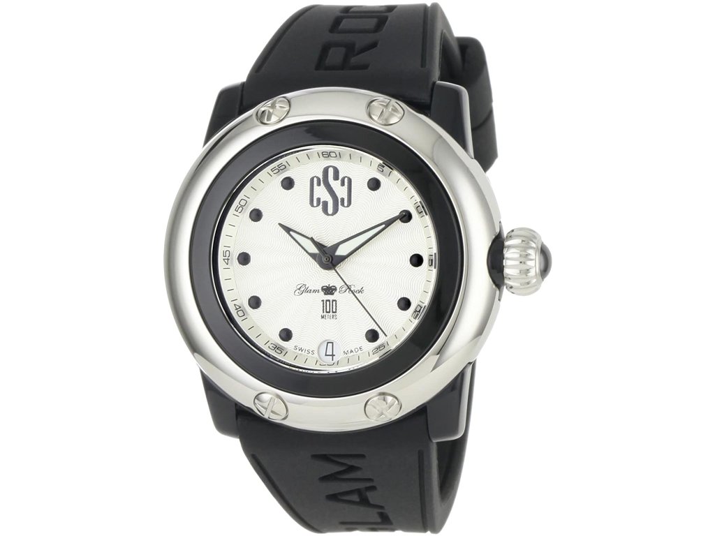 HODINKY GLAM ROCK WOMAN GR64002 (40MM). Typ mechanizmu: ŠVAJČIARSKY OKRÚHLY QUARTZ. Displej: HODINKY: ANALÓGOVÉ. Materiál puzdra: MATERIÁL PUZDRA: POLYKLARBONÁT. Farba puzdra: FARBA PUZDRA: ČIERNA. Materiál náramku: MATERIÁL: SILIKÓN. Farba náramku: FARBA NÁRAMKU: ČIERNA. Farba ciferníka: BIELA. Typ skla: SKLÍČKO: SAFFIR. Clousure: HEBILLA. Priemer ciferníka: dĹŽKA HODINOVÉHO STROJČEKA: 40 MM. Ponoriteľnosť: 10ATM
