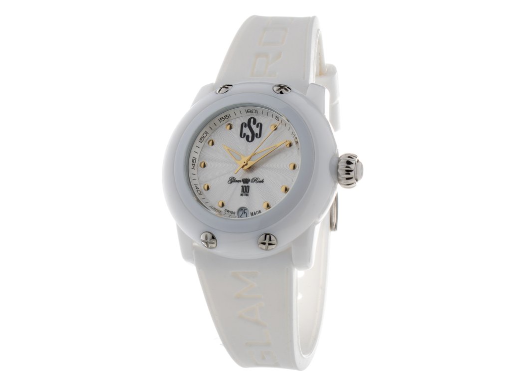 HODINKY GLAM ROCK WOMAN GR64005 (40MM). Typ mechanizmu: ŠVAJČIARSKY OKRÚHLY QUARTZ. Displej: HODINKY: ANALÓGOVÉ. Materiál puzdra: MATERIÁL PUZDRA: POLYKLARBONÁT. Farba puzdra: FARBA PUZDRA: BIELA. Materiál náramku: MATERIÁL: SILIKÓN. Farba náramku: FARBA NÁRAMKU: BIELA. Farba ciferníka: BIELA. Typ skla: SKLÍČKO: SAFFIR. Clousure: HEBILLA. Priemer ciferníka: dĹŽKA HODINOVÉHO STROJČEKA: 40 MM. Ponoriteľnosť: 10ATM