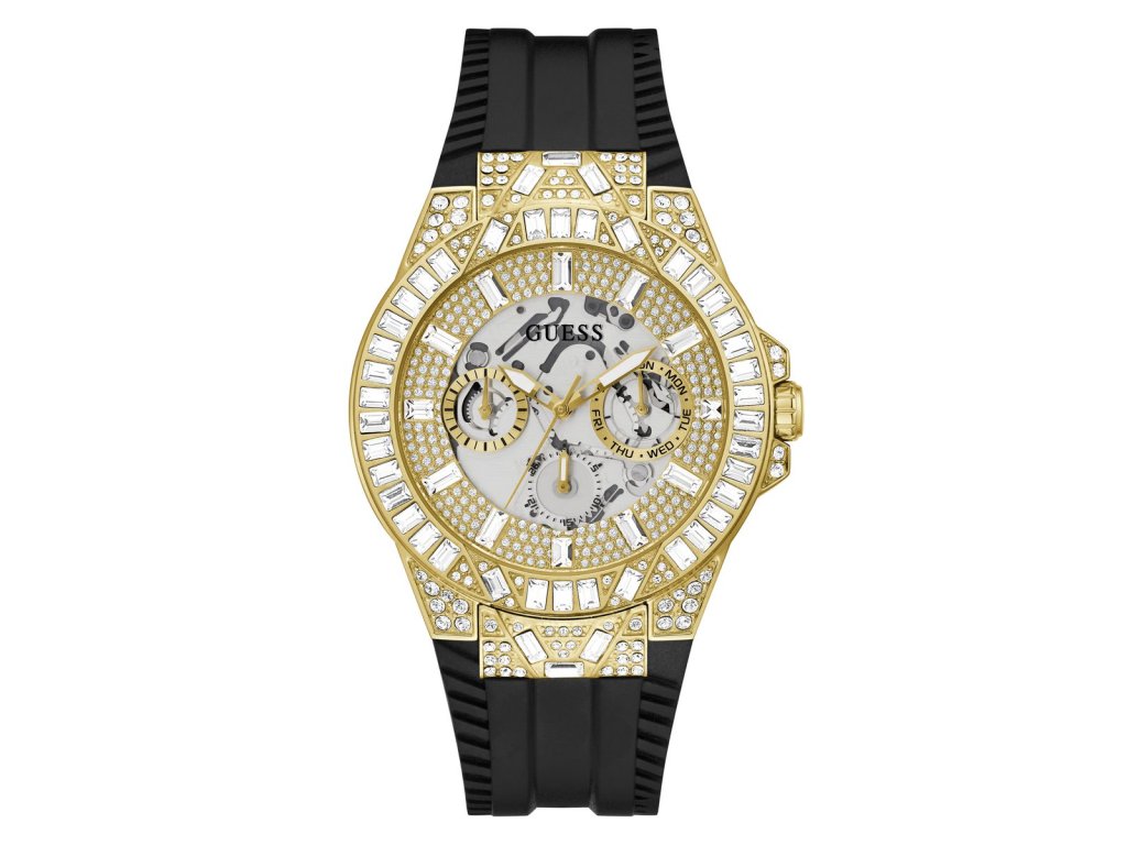 HODINKY GUESS MAN GW0498G2 (45 MM). Typ mechanizmu: QUARTZ. Displej: HODINKY: ANALÓGOVÉ. Materiál puzdra: MATERIÁL: NEHRDZAVEJÚCA OCEĽ. Farba puzdra: FARBA: ZLATÁ. Materiál náramku: MATERIÁL NÁRAMKU: SILIKÓN. Farba náramku: FARBA NÁRAMKU: ČIERNA. Farba ciferníka: FARBA CIFERNÍKA: ŠEDÁ. Typ skla: SKLÍČKO: MINERÁLNE. Kľučka: BUCKLE. Priemer ciferníka: dĹŽKA CIFERNÍKA: 45MM. Ponorný: 5ATM