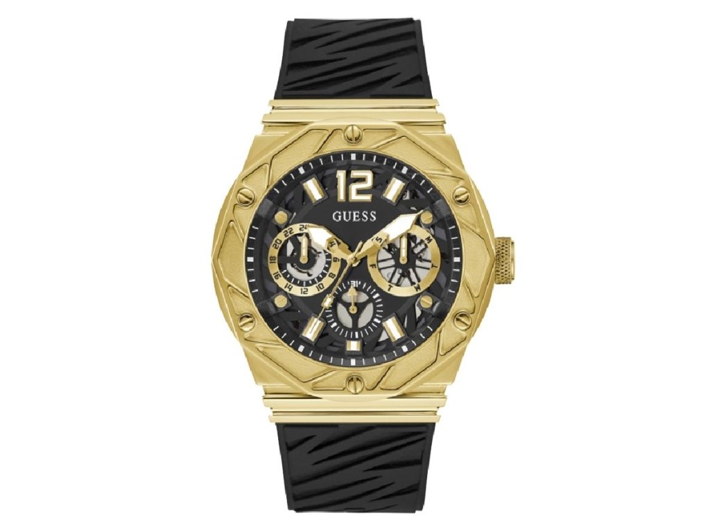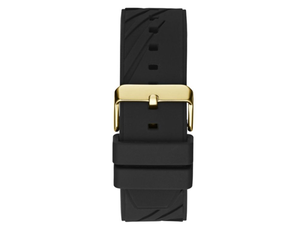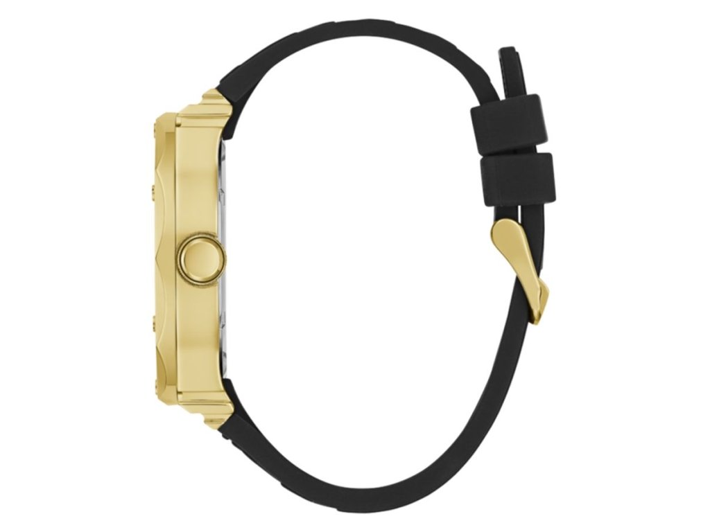 HODINKY GUESS MAN GW0634G2 (47MM). Typ mechanizmu: QUARTZ. Displej: HODINKY: ANALOGICKÉ. Materiál puzdra: MATERIÁL: NEHRDZAVEJÚCA OCEĽ. Farba puzdra: FARBA: ZLATÁ. Materiál náramku: MATERIÁL NÁRAMKU: SILIKÓN. Farba náramku: FARBA NÁRAMKU: ČIERNA. Farba ciferníka: ČIERNA. Typ skla: MINERÁLNE. Kľučka: BUCKLE. Priemer ciferníka: dĹŽKA CIFERNÍKA: 47 MM. Ponorný: 5ATM