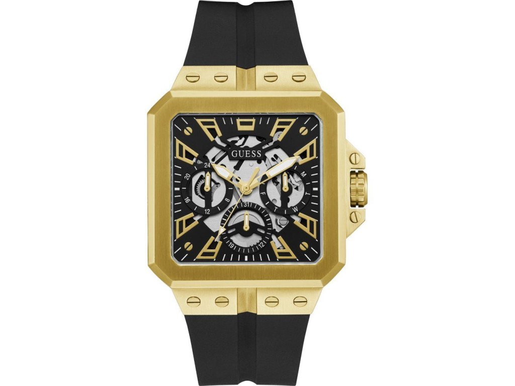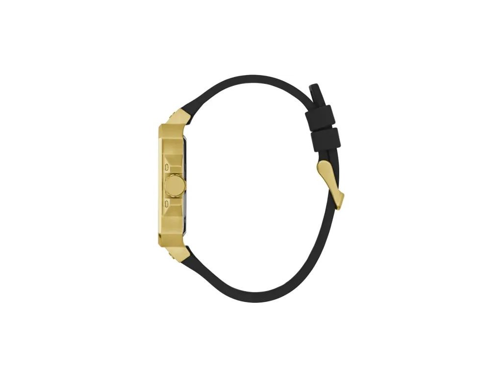 HODINKY GUESS MAN GW0637G2 (42MM). Typ mechanizmu: QUARTZ. Displej: HODINKY: ANALOGICKÉ. Materiál puzdra: MATERIÁL: NEHRDZAVEJÚCA OCEĽ. Farba puzdra: FARBA: ZLATÁ. Materiál náramku: MATERIÁL NÁRAMKU: SILIKÓN. Farba náramku: FARBA NÁRAMKU: ČIERNA. Farba ciferníka: ČIERNA. Typ skla: MINERÁLNE. Kľučka: BUCKLE. Priemer ciferníka: dĹŽKA CIFERNÍKA: 42MM. Ponorný: NE