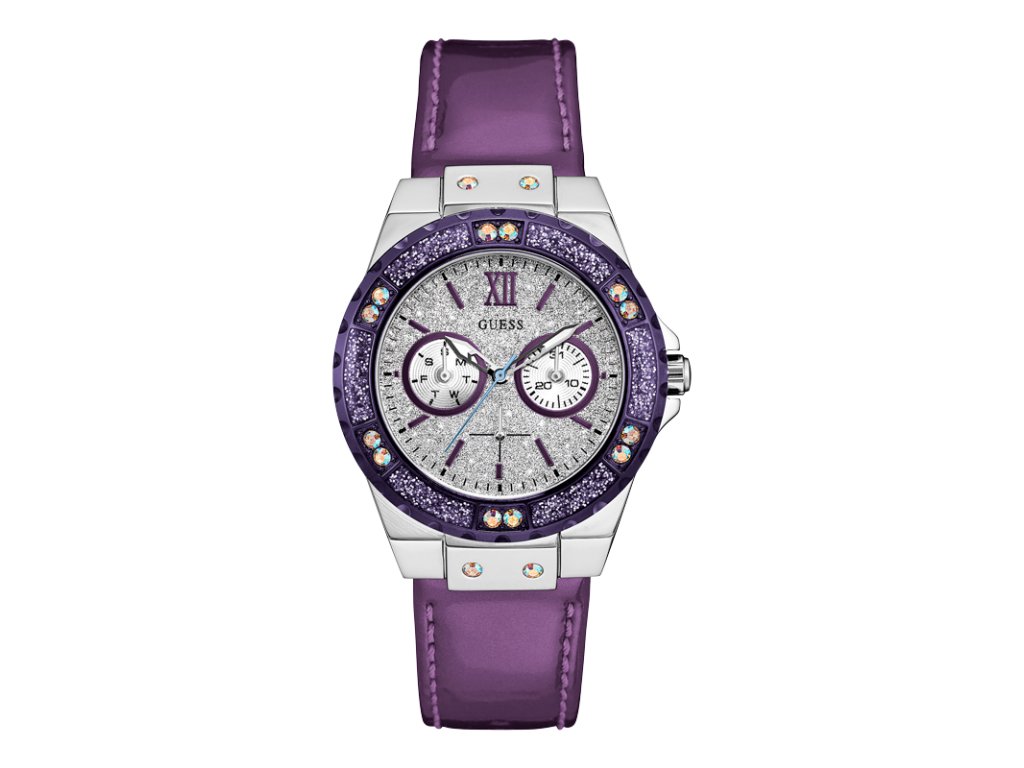 HODINKY GUESS WOMAN W0775L6 (38MM). Typ mechanizmu: QUARTZ. Displej: HODINKY: MULTIFUNKČNÉ. Materiál puzdra: MATERIÁL PUZDRA: OCEĽ. Farba puzdra: STRIEBORNÁ: FARBA PUZDRA: STRIEBORNÁ. Materiál náramku: MATERIÁL: PU & KOŽENÝ REMIENOK. Farba náramku: lila. Farba ciferníka: STRIEBORNÁ. Typ skla: SKLÍČKO: MINERÁLNE. Kľučka: BUCKLE. Priemer ciferníka: dĹŽKA CIFERNÍKA: 38MM. Ponorný: 5ATM