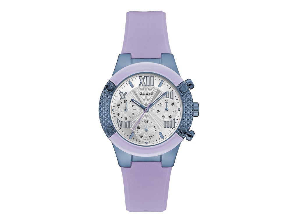 HODINKY GUESS WOMAN W0958L2 (38MM). Typ mechanizmu: QUARTZ. Displej: HODINKY: ANALÓGOVÉ. Materiál puzdra: MATERIÁL PUZDRA: OCEĽ. Farba puzdra: modrá. Materiál náramku: MATERIÁL: SILIKÓN. Farba náramku: lila. Farba ciferníka: STRIEBORNÁ. Typ skla: FARBA: MINERÁL. Kľučka: BUCKLE. Priemer ciferníka: dĹŽKA CIFERNÍKA: 38MM. Ponorný: NE