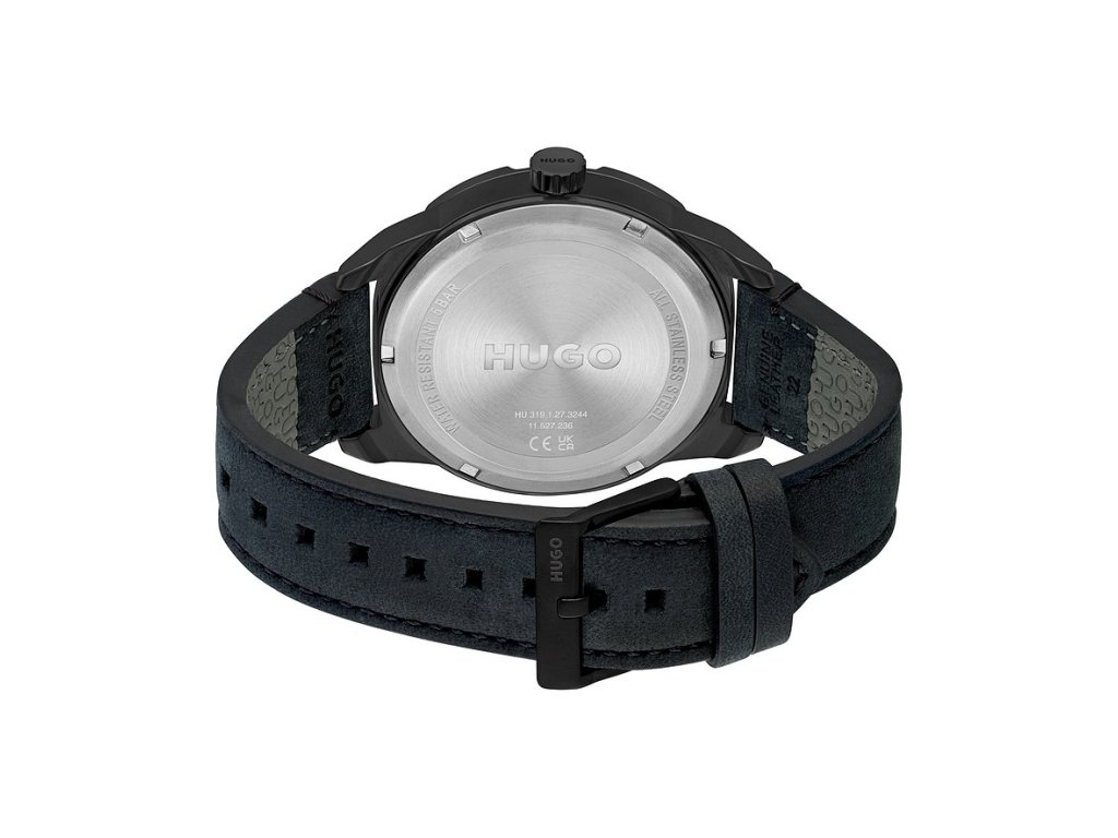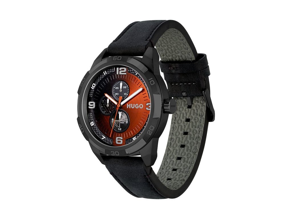 HODINKY HUGO MAN 1530275 (45MM). Typ mechanizmu: QUARTZ. Displej: HODINKY: ANALÓGOVÉ. Materiál puzdra: MATERIÁL: NEHRDZAVEJÚCA OCEĽ. Farba puzdra: FARBA PUZDRA: ČIERNA. Materiál náramku: MATERIÁL NÁRAMKU: KOŽA. Farba náramku: FARBA NÁRAMKU: ČIERNA. Farba ciferníka: ČIERNO-ORANŽOVÁ. Typ skla: SKLÍČKO: MINERÁLNE. Kľučka: BUCKLE. Priemer ciferníka: dĹŽKA CIFERNÍKA: 45MM. Ponorný: 5ATM