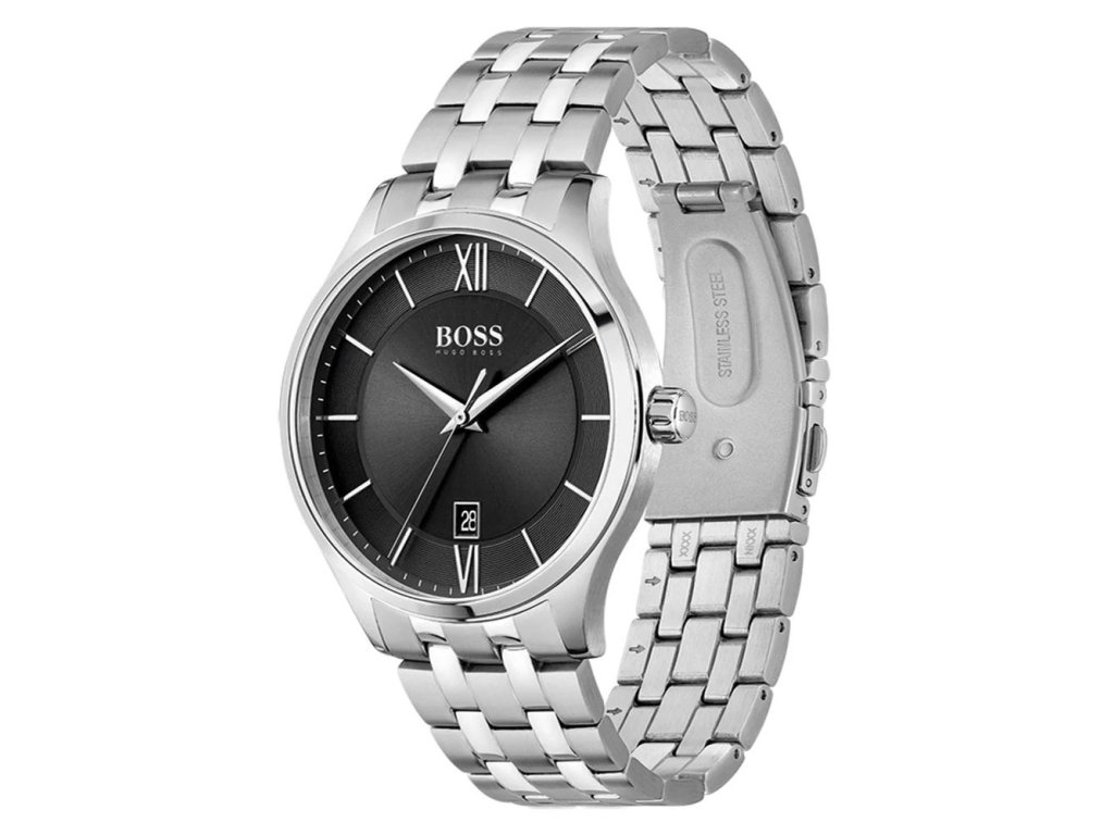 HODINKY HUGO BOSS MAN 1513896 (41MM). Typ mechanizmu: QUARTZ. Displej: HODINKY: ANALÓGOVÉ. Materiál puzdra: MATERIÁL: NEHRDZAVEJÚCA OCEĽ. Farba puzdra: FARBA PUZDRA: ŠEDÁ. Materiál náramku: MATERIÁL NÁRAMKU: NEHRDZAVEJÚCA OCEĽ. Farba náramku: FARBA NÁRAMKU: ŠEDÁ. Farba ciferníka: ČIERNA. Typ skla: SKLÍČKO: MINERÁLNE. Clousure: BUTTERFLY. Priemer ciferníka: pRIEMER CIFERNÍKA: 41MM. Ponoriteľnosť: 5ATM