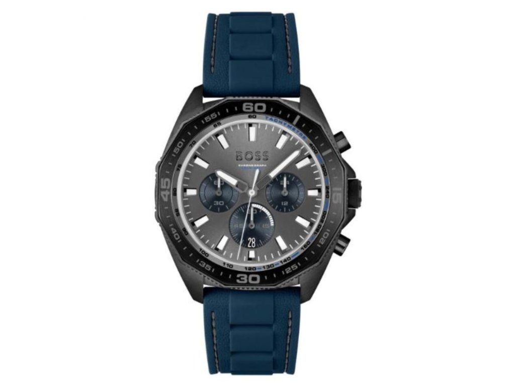 HODINKY HUGO BOSS MAN 1513972 (44 MM). Typ mechanizmu: QUARTZ. Displej: HODINKY: ANALÓGOVÉ. Materiál puzdra: MATERIÁL: NEHRDZAVEJÚCA OCEĽ. Farba puzdra: FARBA PUZDRA: ŠEDÁ. Materiál náramku: MATERIÁL NÁRAMKU: SILIKÓN. Farba náramku: FARBA NÁRAMKU: MODRÁ. Farba ciferníka: FARBA CIFERNÍKA: ŠEDÁ. Typ skla: SKLÍČKO: MINERÁLNE. Kľučka: BUCKLE. Priemer ciferníka: dĹŽKA CIFERNÍKA: 44 MM. Ponoriteľnosť: 5 ATM