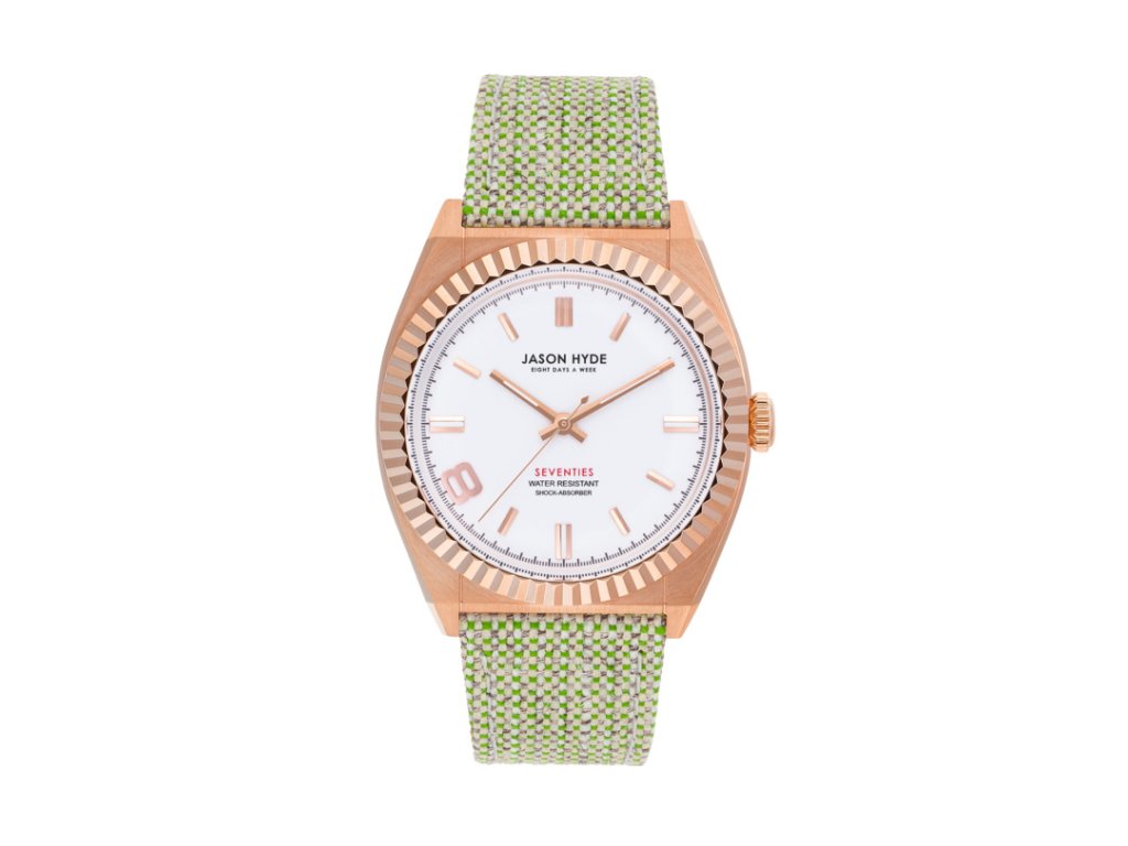 HODINKY JASON HYDE WOMAN JH20011 (36MM). Typ mechanizmu: QUARTZ. Displej: HODINKY: ANALÓGOVÉ. Materiál puzdra: MATERIÁL: NEHRDZAVEJÚCA OCEĽ. Farba puzdra: FARBA PUZDRA: RUŽOVÉ ZLATO. Materiál náramku: MATERIÁL NÁRAMKU: TEXTIL. Farba náramku: FARBA: ZELENÁ. Farba ciferníka: BIELA. Typ skla: SKLÍČKO: MINERÁLNE. Kľučka: BUCKLE. Priemer ciferníka: dĹŽKA CIFERNÍKA: 36MM. Ponorný: 5ATM