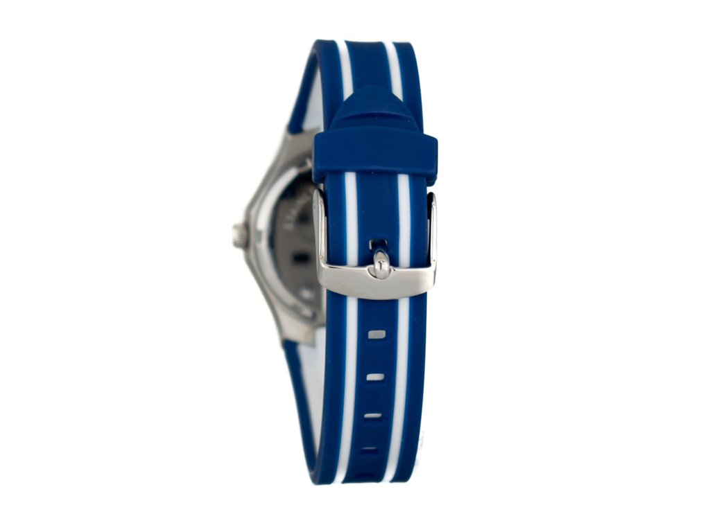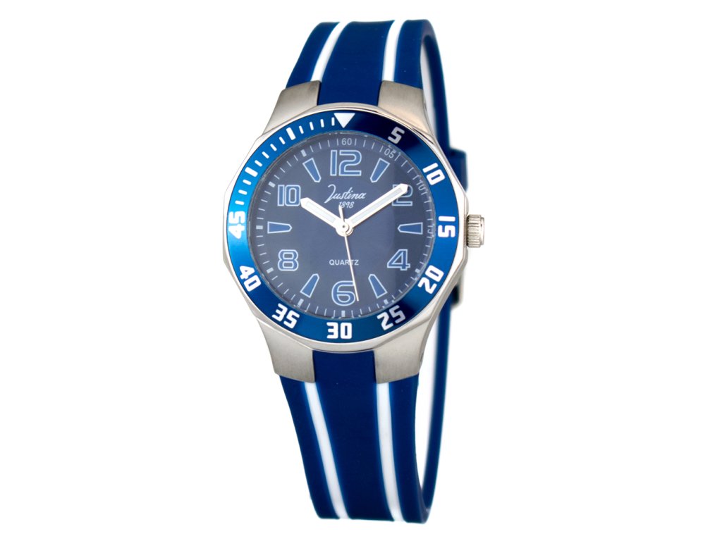 HODINKY JUSTINA WOMAN 11910A (31MM). Typ mechanizmu: QUARTZ. Displej: HODINKY: ANALOGICKÉ. Materiál puzdra: MATERIÁL PUZDRA: OCEĽ. Farba puzdra: STRIEBORNÁ: FARBA PUZDRA: STRIEBORNÁ. Materiál náramku: MATERIÁL NÁRAMKU: GUMA. Farba náramku: FARBA NÁRAMKU: MODRÁ BIELA. Farba ciferníka: MODRÁ. Typ skla: SKLÍČKO: MINERÁLNE. Clousure: TLAKOVÁ NÁDOBA: TLAKOVÁ NÁDOBA. Priemer ciferníka: dĹŽKA CIFERNÍKA: 31MM. Ponorný: NE