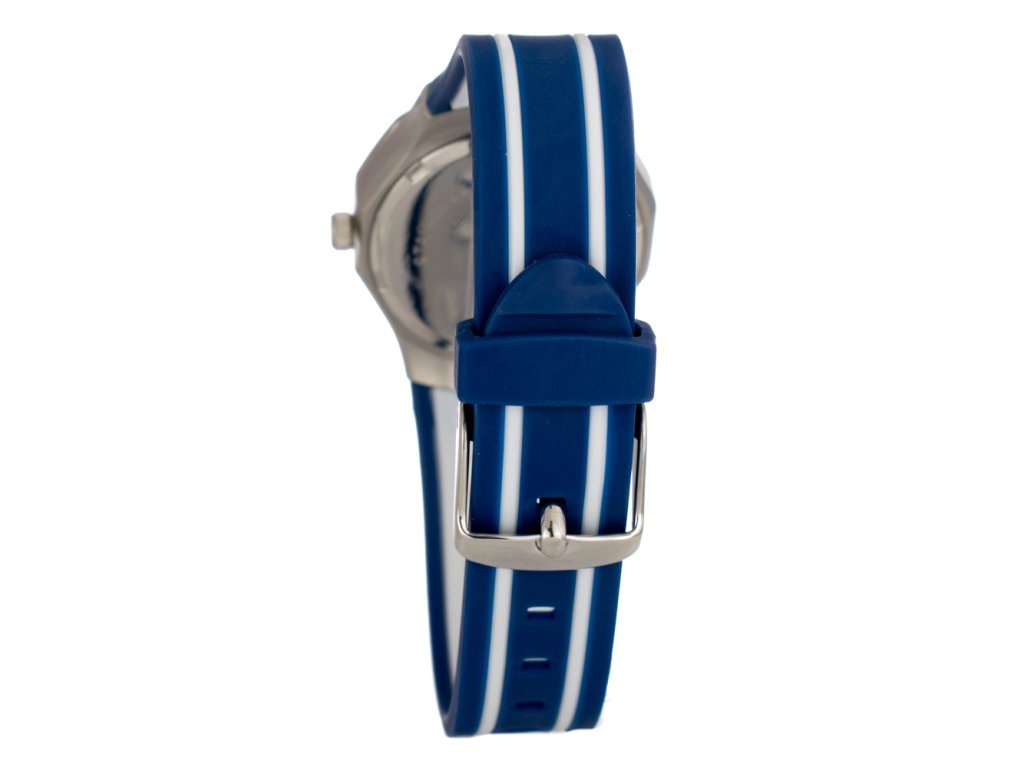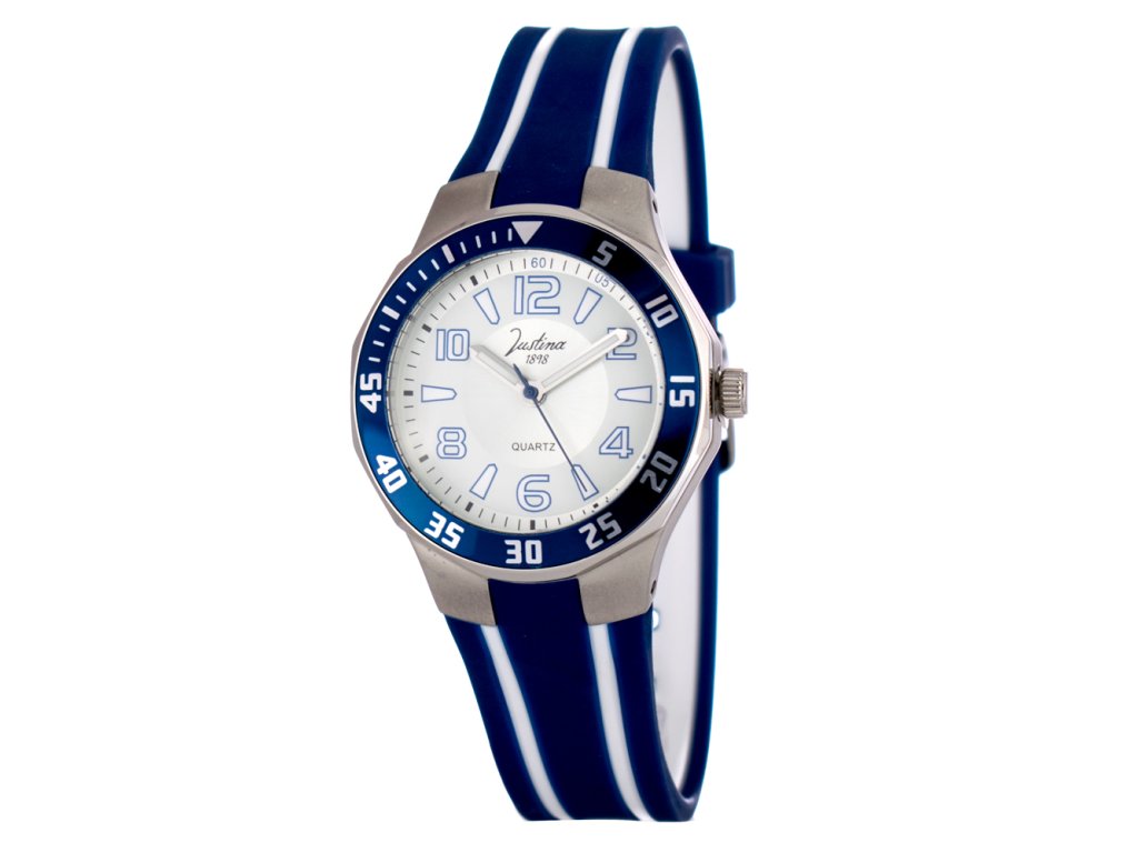 HODINKY JUSTINA WOMAN 11910AB (31MM). Typ mechanizmu: QUARTZ. Displej: TYP: ANALÓGOVÝ. Materiál puzdra: MATERIÁL PUZDRA: OCEĽ. Farba puzdra: STRIEBORNÁ: FARBA PUZDRA: STRIEBORNÁ. Materiál náramku: MATERIÁL NÁRAMKU: GUMA. Farba náramku: FARBA NÁRAMKU: MODRÁ BIELA. Farba ciferníka: BIELA. Typ skla: SKLÍČKO: MINERÁLNE. Kľučka: BUCKLE. Priemer ciferníka: dĹŽKA CIFERNÍKA: 31MM. Ponorný: NE