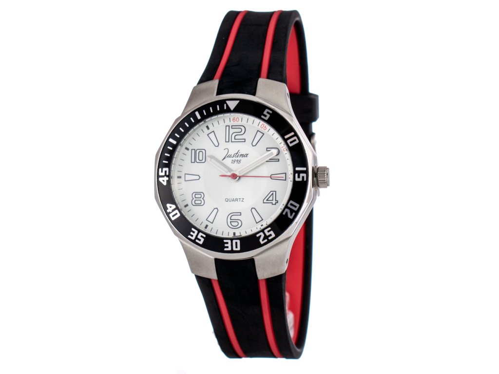 HODINKY JUSTINA WOMAN 11910B (31MM). Typ mechanizmu: QUARTZ. Displej: TYP: ANALÓGOVÝ. Materiál puzdra: MATERIÁL PUZDRA: OCEĽ. Farba puzdra: STRIEBORNÁ: FARBA PUZDRA: STRIEBORNÁ. Materiál náramku: MATERIÁL NÁRAMKU: GUMA. Farba náramku: FARBA NÁRAMKU: ČIERNA. Farba ciferníka: BIELA. Typ skla: SKLÍČKO: MINERÁLNE. Kľučka: BUCKLE. Priemer ciferníka: dĹŽKA CIFERNÍKA: 31MM. Ponorný: NE