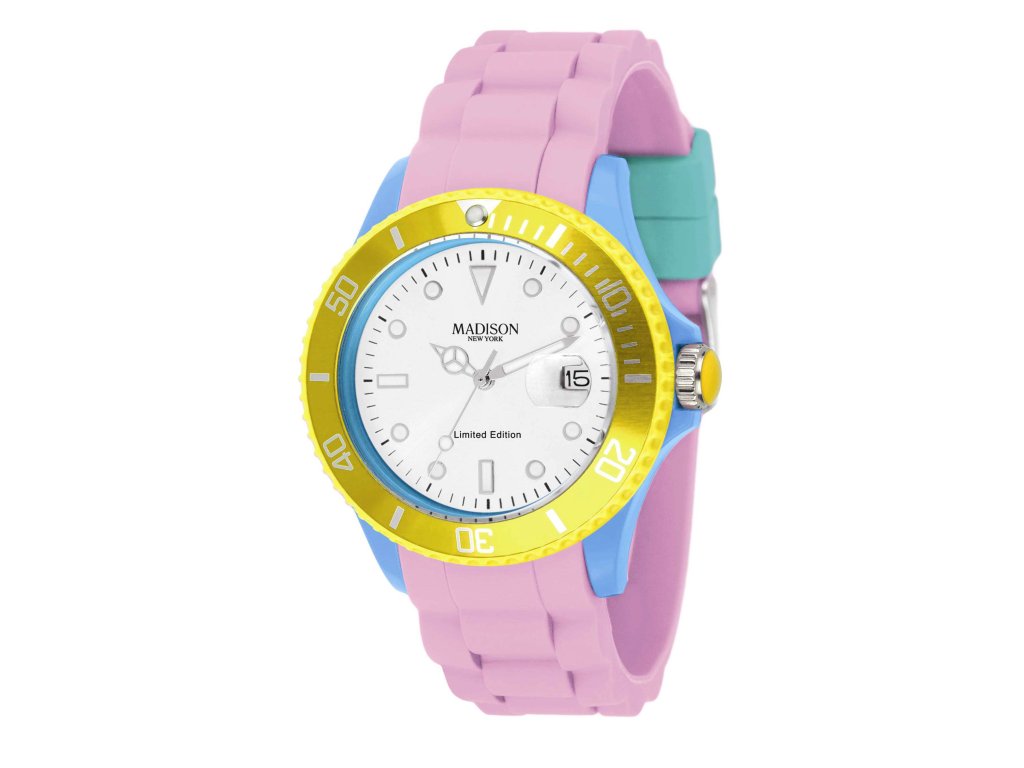 HODINKY MADISON WOMAN U4484 (40MM). Typ mechanizmu: QUARTZ. Displej: DISPLEJ: ANALÓGOVÝ. Materiál puzdra: MATERIÁL PUZDRA: PLAST. Farba puzdra: FARBA PUZDRA: NEBESKY MODRÁ. Materiál náramku: MATERIÁL NÁRAMKU: GUMA. Farba náramku: FARBA NÁRAMKU: RUŽOVÁ. Farba ciferníka: BIELA. Typ skla: SKLÍČKO: MINERÁLNE. Kľučka: BUCKLE. Priemer ciferníka: dĹŽKA CIFERNÍKA: 40MM. Ponoriteľnosť: 5atm
