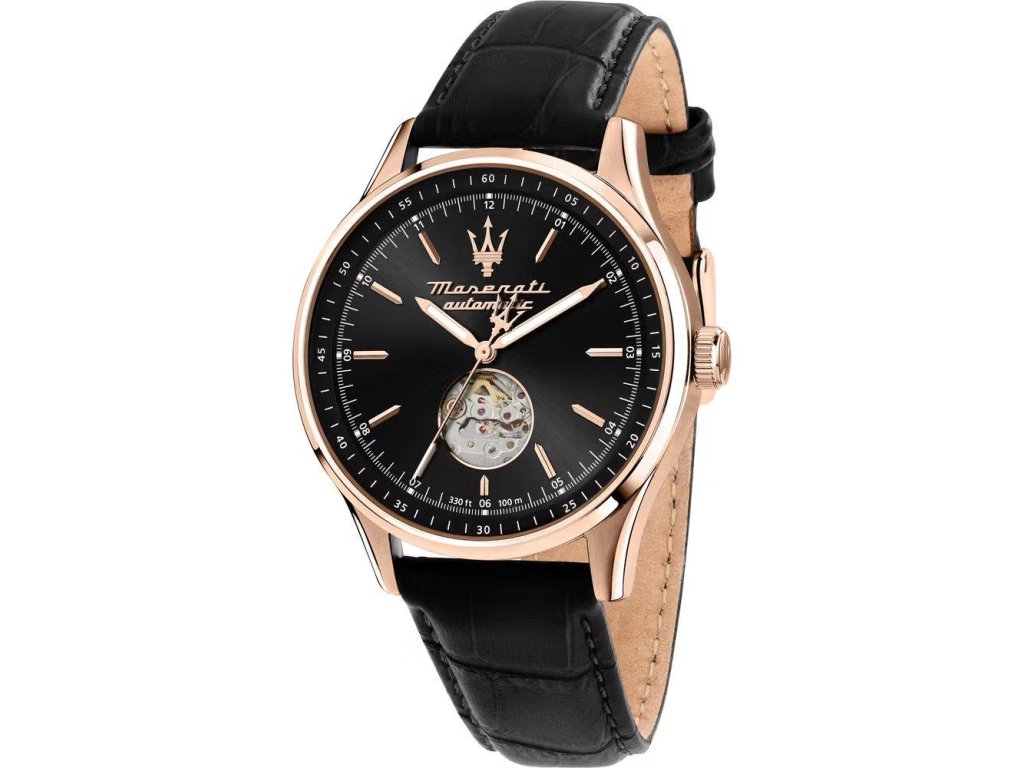 HODINKY MASERATI MAN R8821124001 (42MM). Typ mechanizmu: TYP: AUTOMATICKÝ. Displej: TYP: ANALÓGOVÝ. Materiál puzdra: MATERIÁL: NEREZOVÁ OCEĽ. Farba puzdra: FARBA PUZDRA: RUŽOVÁ. Materiál náramku: MATERIÁL NÁRAMKU: KOŽA. Farba náramku: FARBA NÁRAMKU: ČIERNA. Farba ciferníka: ČIERNA. Typ skla: SKLÍČKO: MINERÁLNE. Kľučka: BUCKLE. Priemer ciferníka: dĹŽKA CIFERNÍKA: 42MM. Ponorný: 10ATM