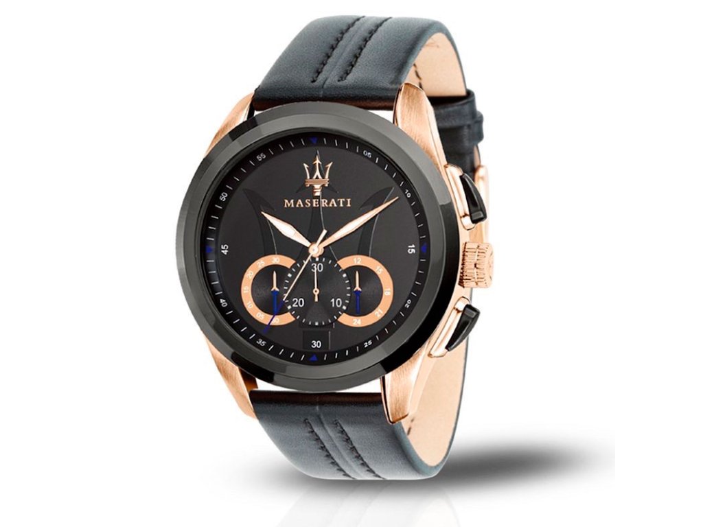 HODINKY MASERATI MAN R8871612027 (45MM). Typ mechanizmu: QUARTZ. Displej: HODINKY: ANALOGICKÉ. Materiál puzdra: MATERIÁL: NEHRDZAVEJÚCA OCEĽ. Farba puzdra: FARBA: ZLATÁ. Materiál náramku: MATERIÁL NÁRAMKU: KOŽA. Farba náramku: FARBA NÁRAMKU: ČIERNA. Farba ciferníka: ČIERNA. Typ skla: SKLÍČKO: MINERÁLNE. Kľučka: BUCKLE. Priemer ciferníka: dĹŽKA CIFERNÍKA: 45MM. Ponorný: 5ATM